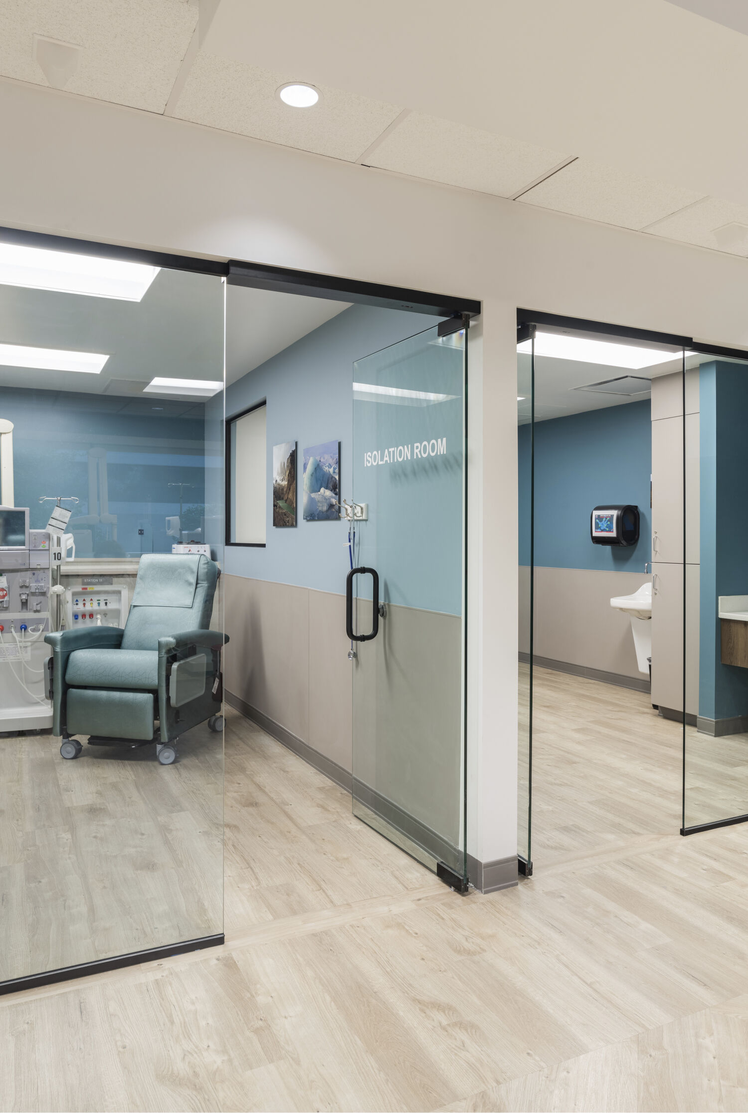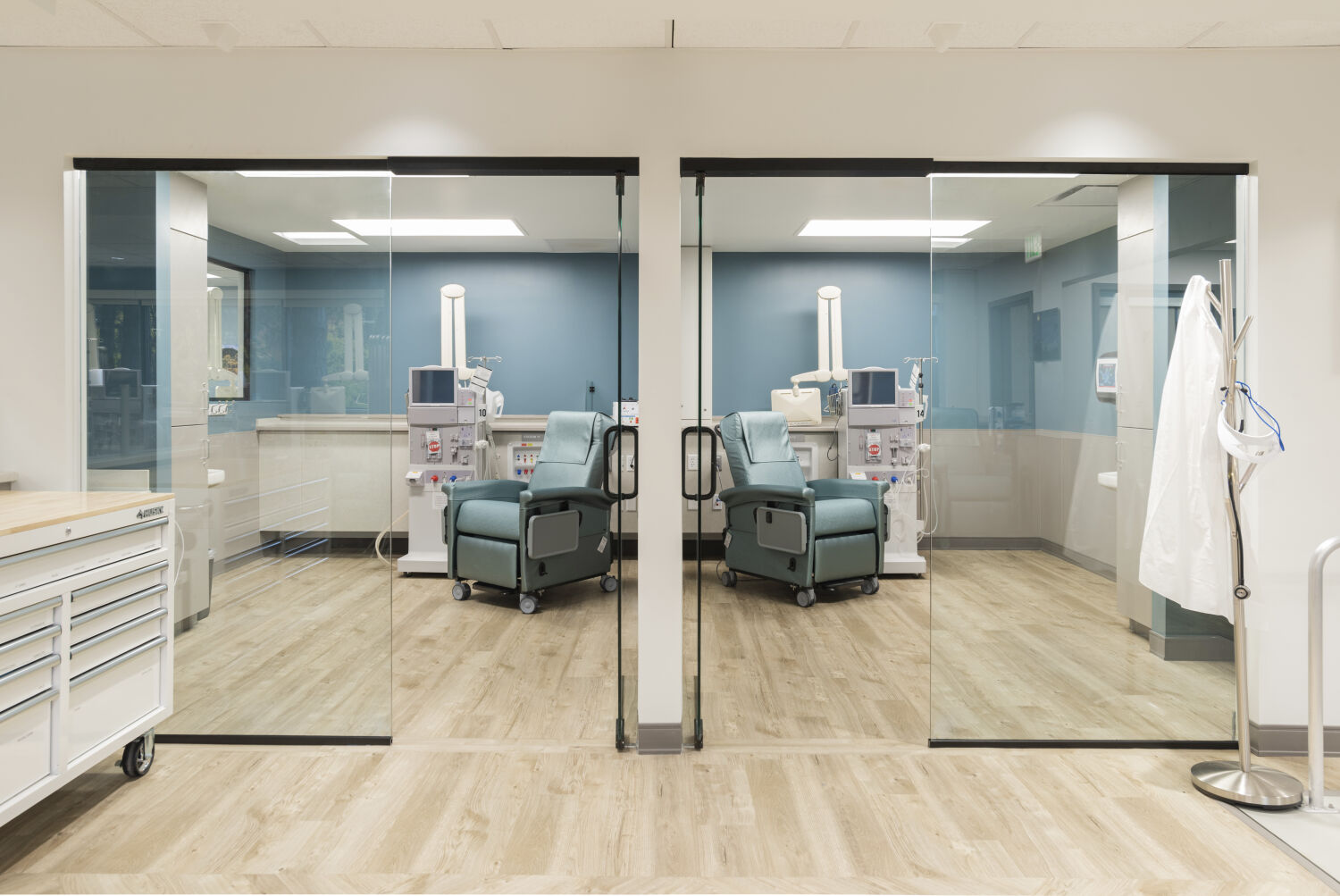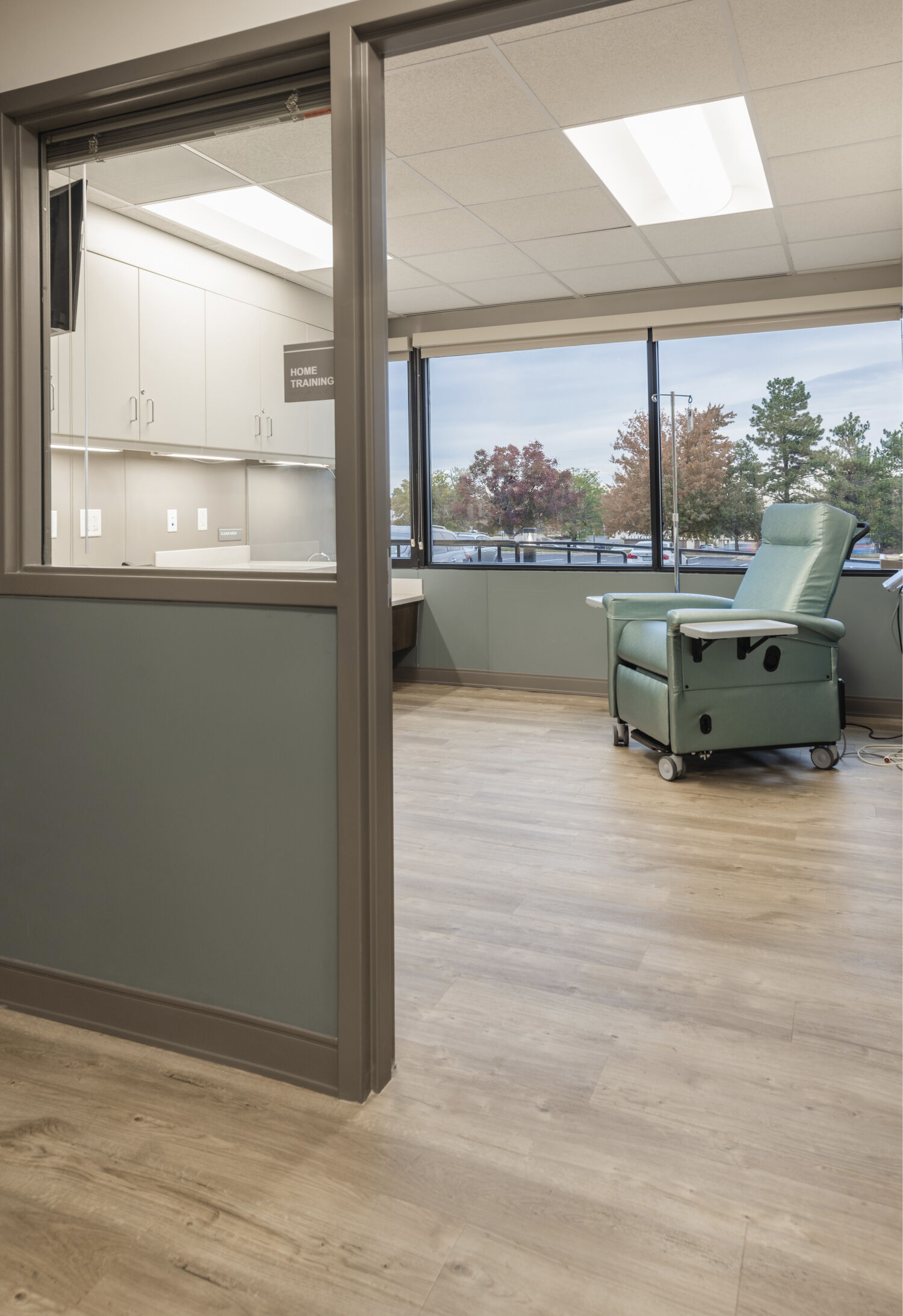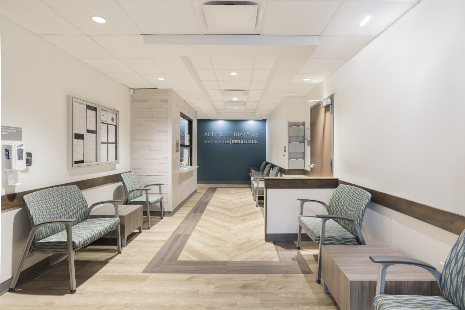 Altitude Dialysis introduces a new model for renal care, providing patients with the tools, training, and support to perform dialysis at home. This 6,000-SF clinic combines clinical functionality with a home-like environment to support patient education and treatment. The facility includes 12 infusion bays, three training rooms, a nephrology clinic with two exam rooms, a dedicated equipment-cleaning room, administrative offices, and a welcoming waiting area. The project was prioritized by the City of Aurora due to its importance in providing safe care for at-risk patients during the COVID-19 pandemic.