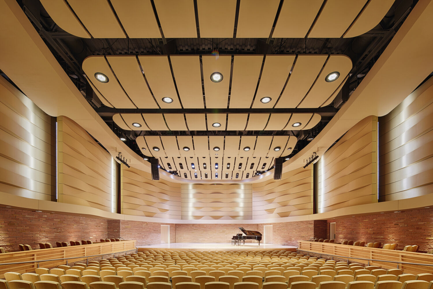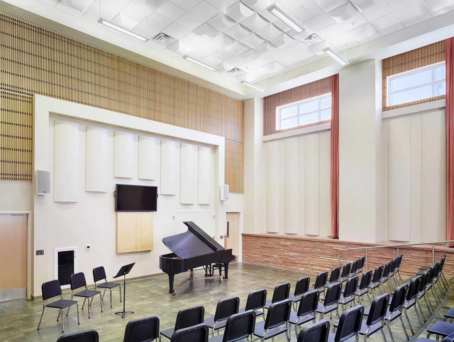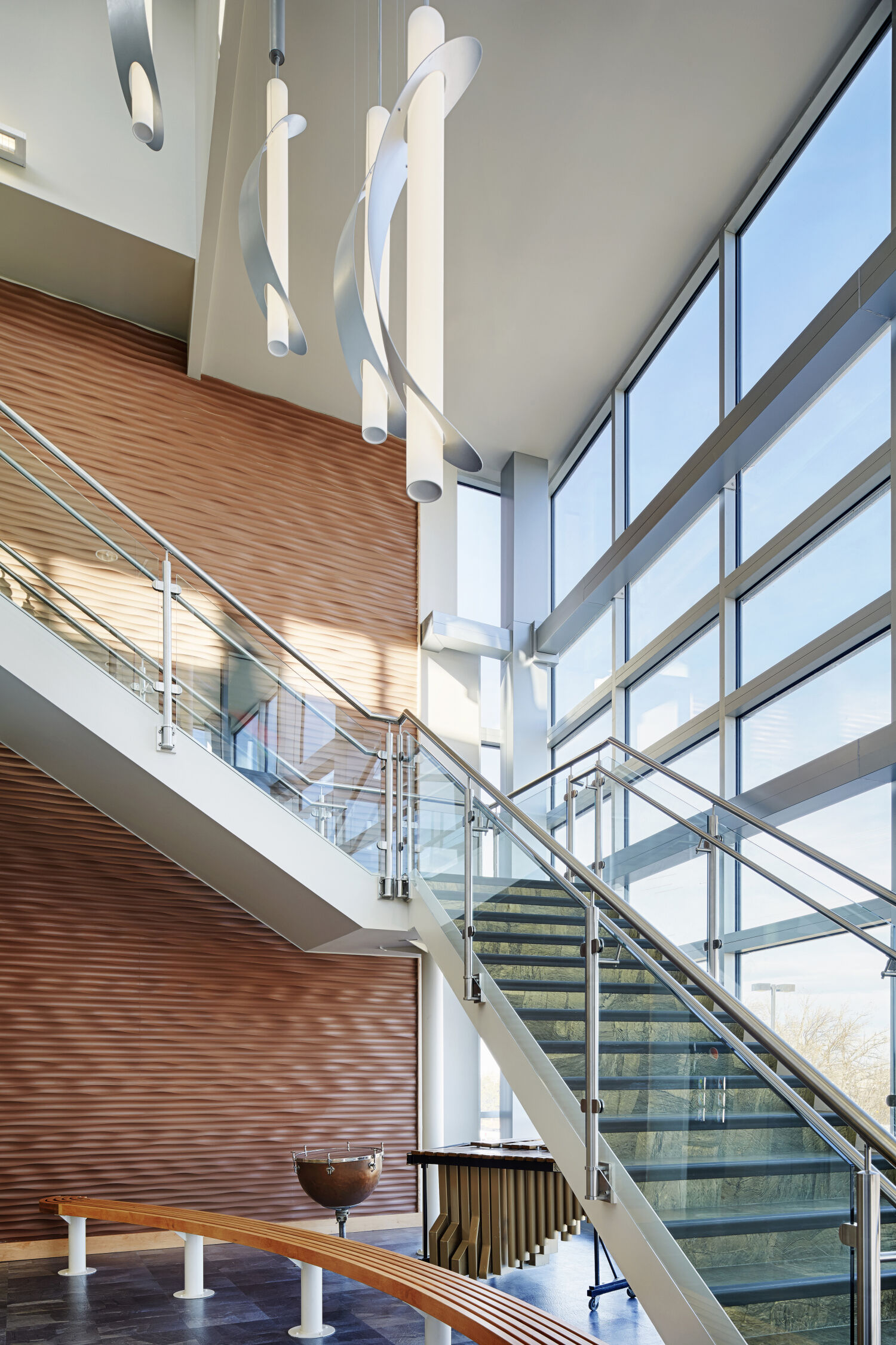 The design reflects both elegance and functionality, emphasizing natural light, acoustical quality, and spatial organization. A concave façade symbolically “embraces” visitors arriving on campus, while a luminous roof monitor acts as a beacon for the surrounding community. Internally, these elements define the main lobby and concourse, guiding students and visitors through a series of interconnected spaces that are bathed in daylight. The building’s design thoughtfully integrates rehearsal and performance spaces into a cohesive, visually striking environment.