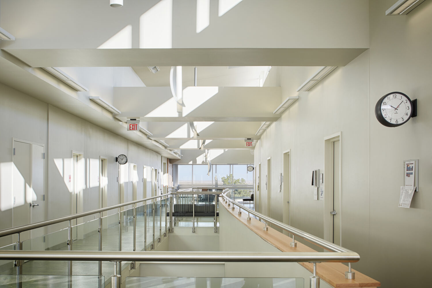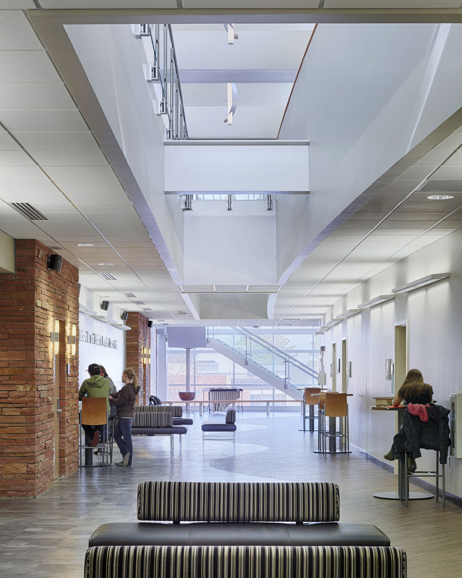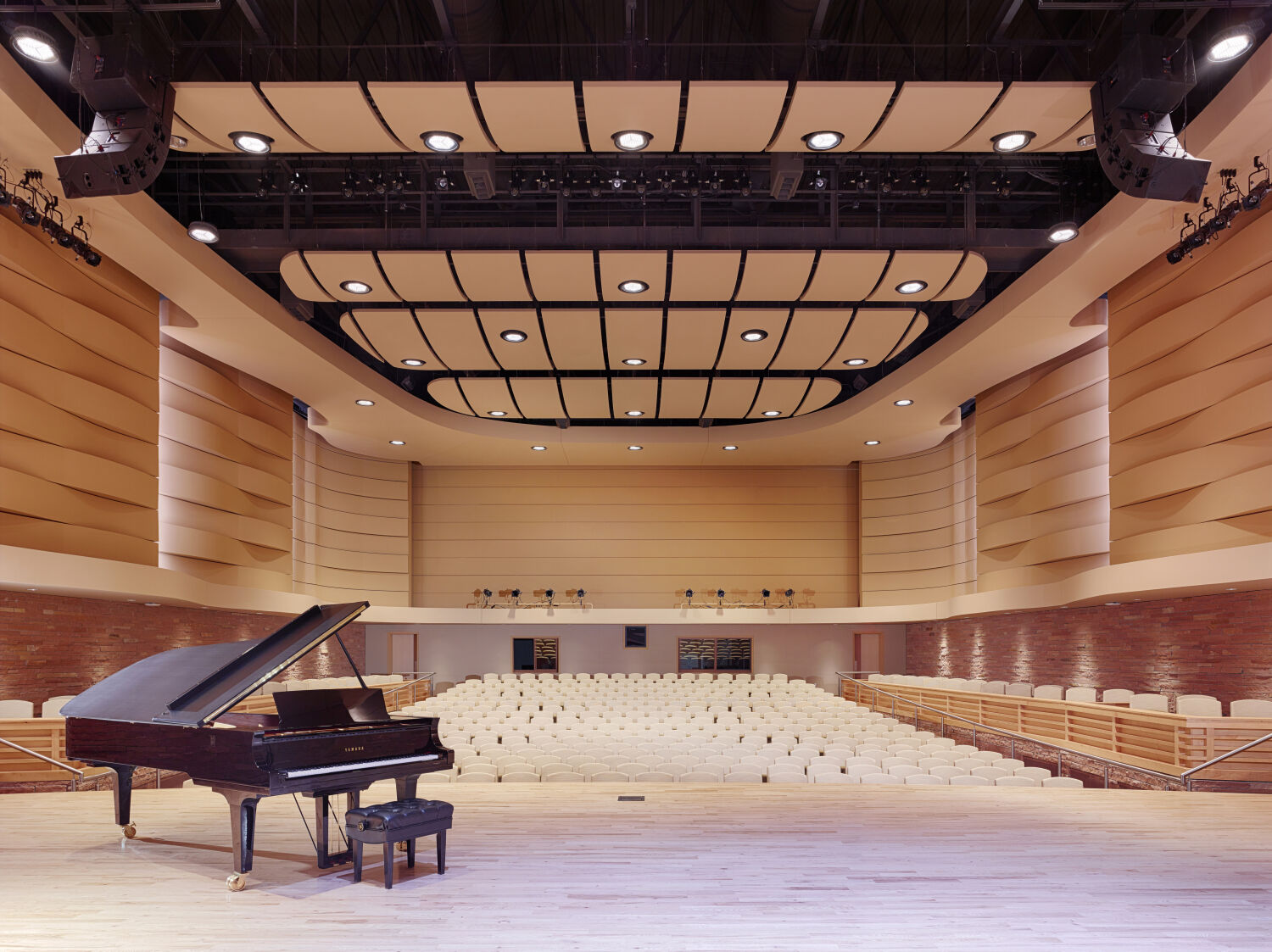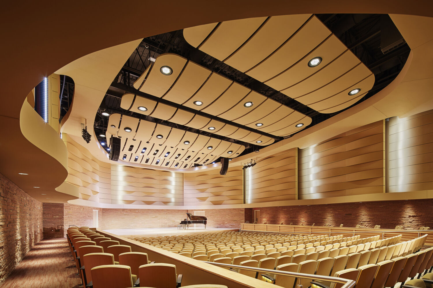 The design reflects both elegance and functionality, emphasizing natural light, acoustical quality, and spatial organization. A concave façade symbolically “embraces” visitors arriving on campus, while a luminous roof monitor acts as a beacon for the surrounding community. Internally, these elements define the main lobby and concourse, guiding students and visitors through a series of interconnected spaces that are bathed in daylight. The building’s design thoughtfully integrates rehearsal and performance spaces into a cohesive, visually striking environment.