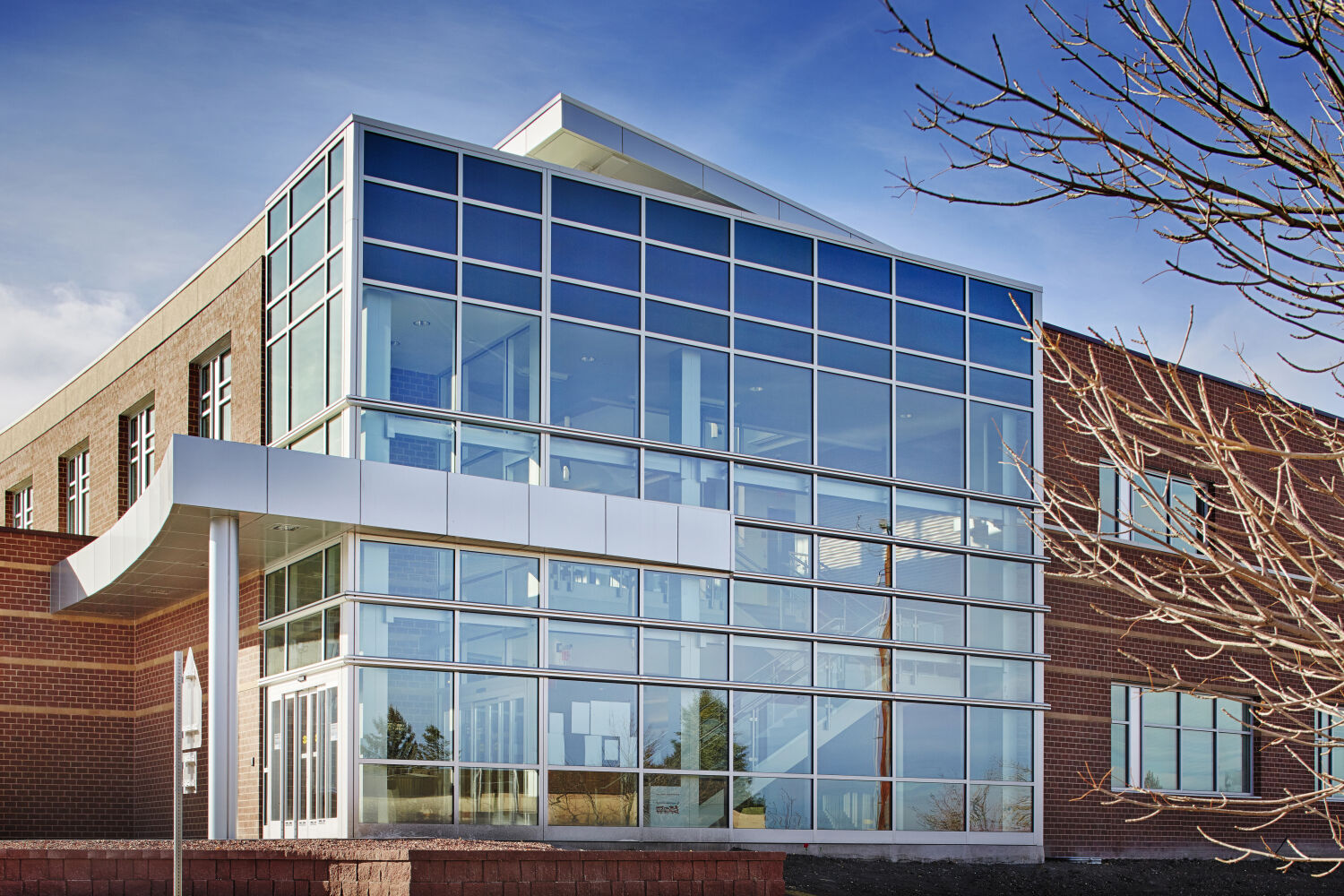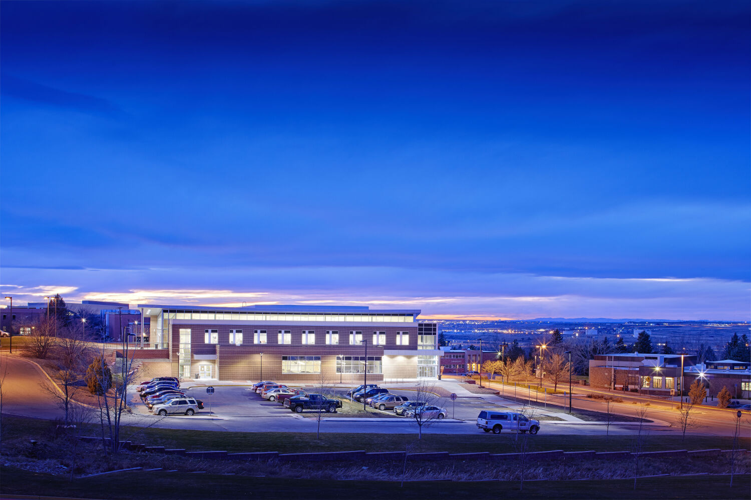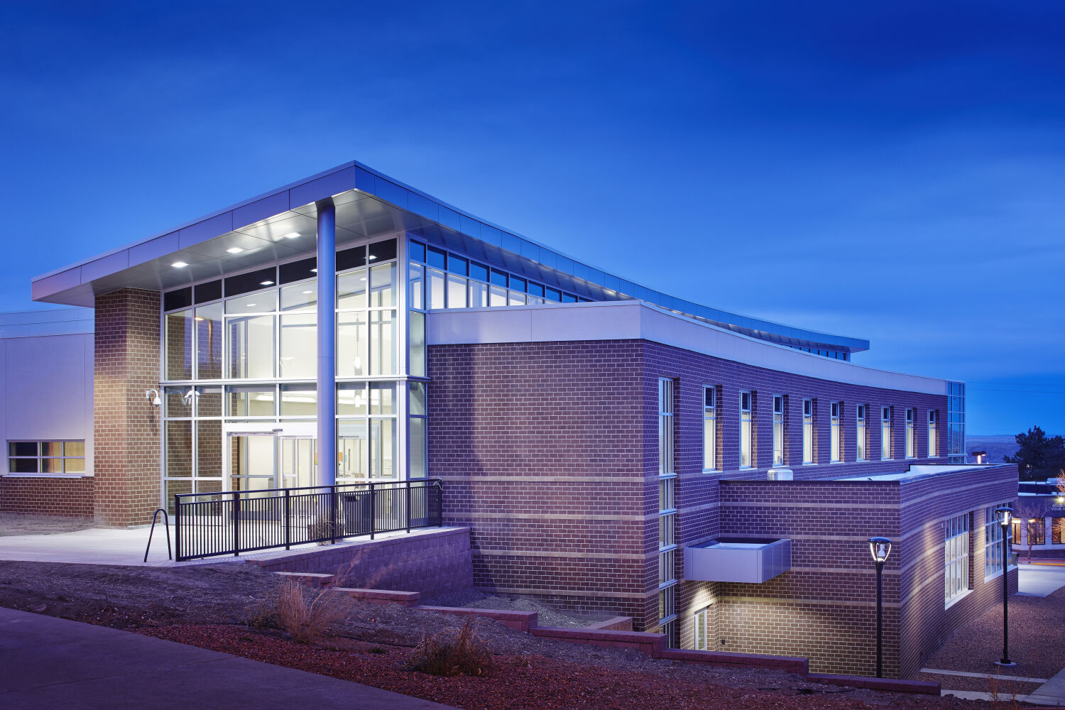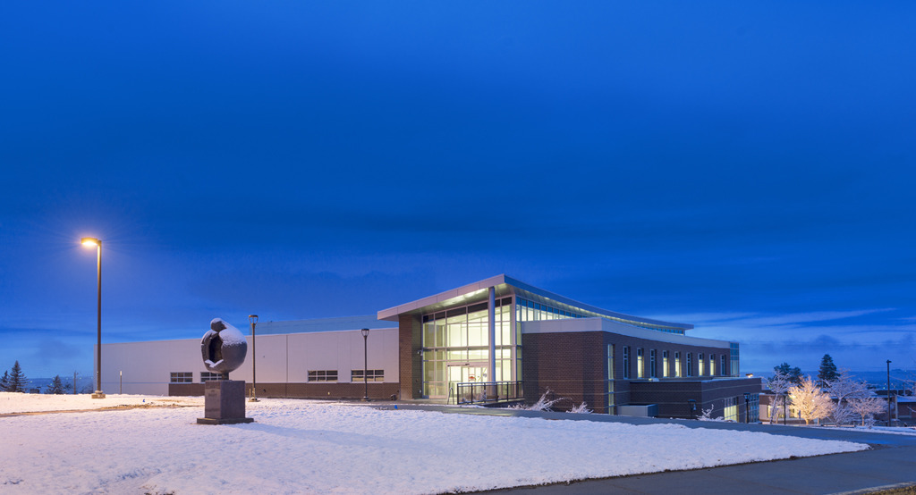 The Casper College Music Facility is a state-of-the-art, 21st-century music center that provides a landmark presence at the entrance to campus. Situated along a hillside, the building houses a 417-seat concert hall, rehearsal spaces for instruments and percussion, a 65-seat choral rehearsal hall, practice rooms, classrooms, faculty studios, and support spaces—all designed to support a comprehensive music education program. This project was designed in partnership with HMS Architects.