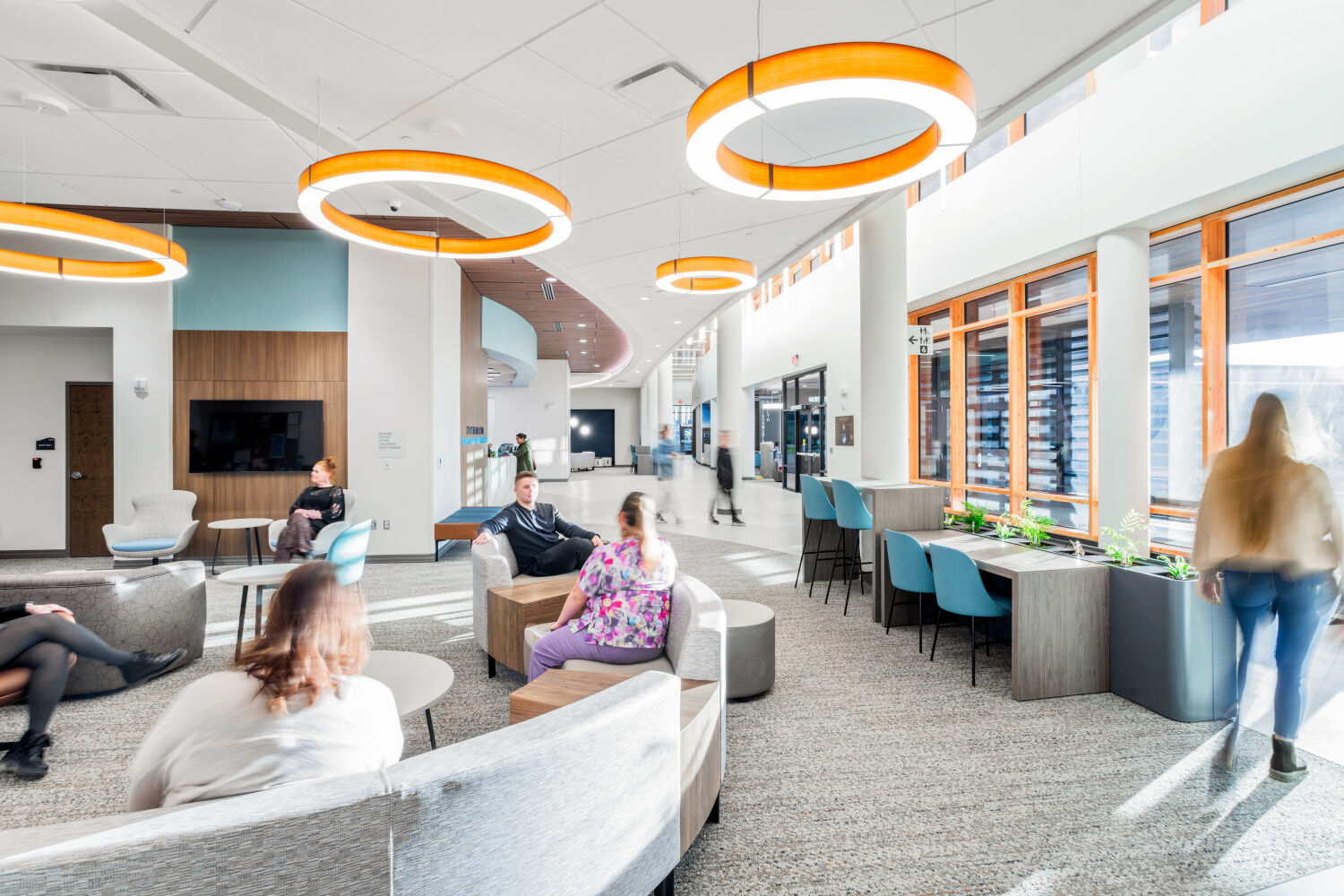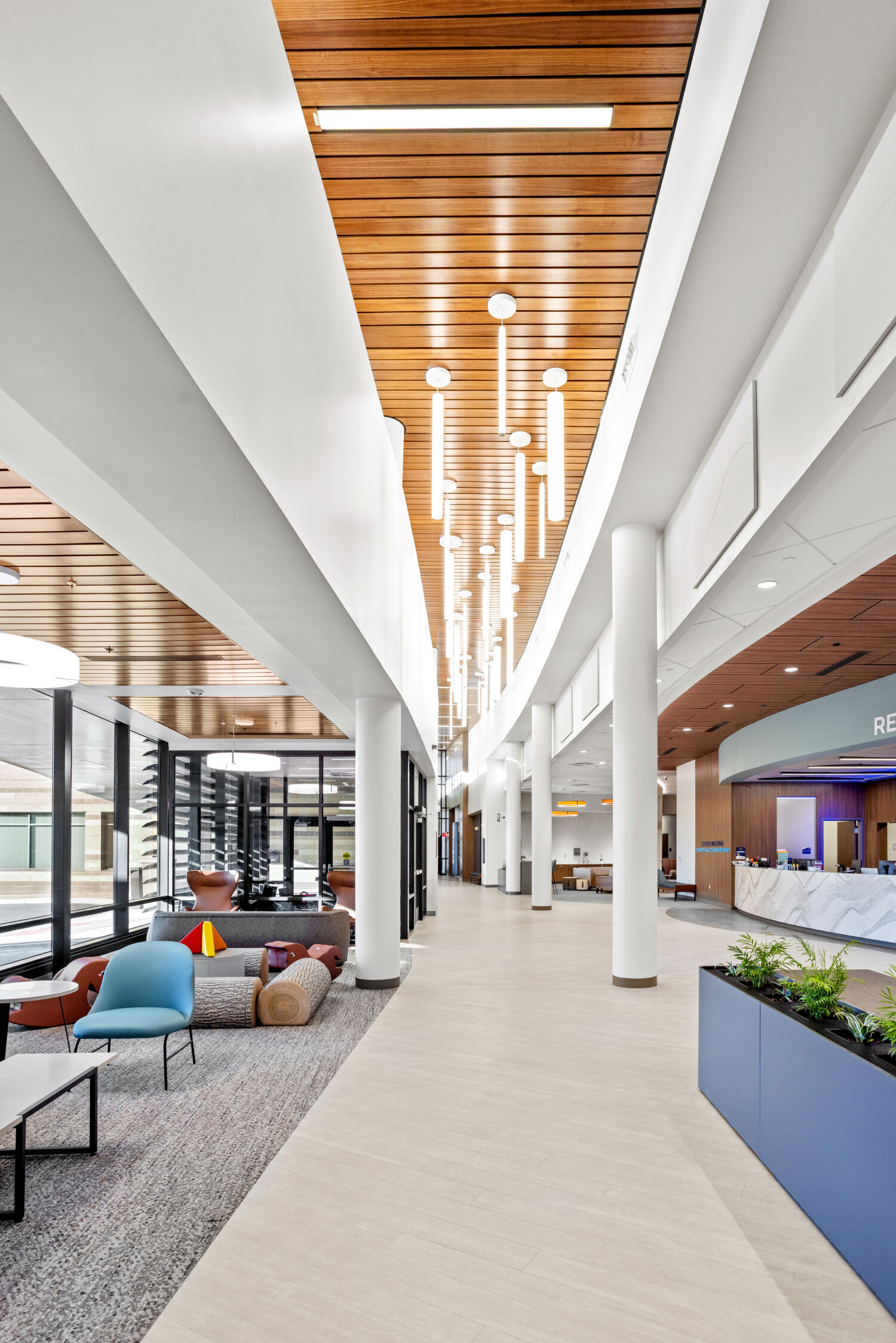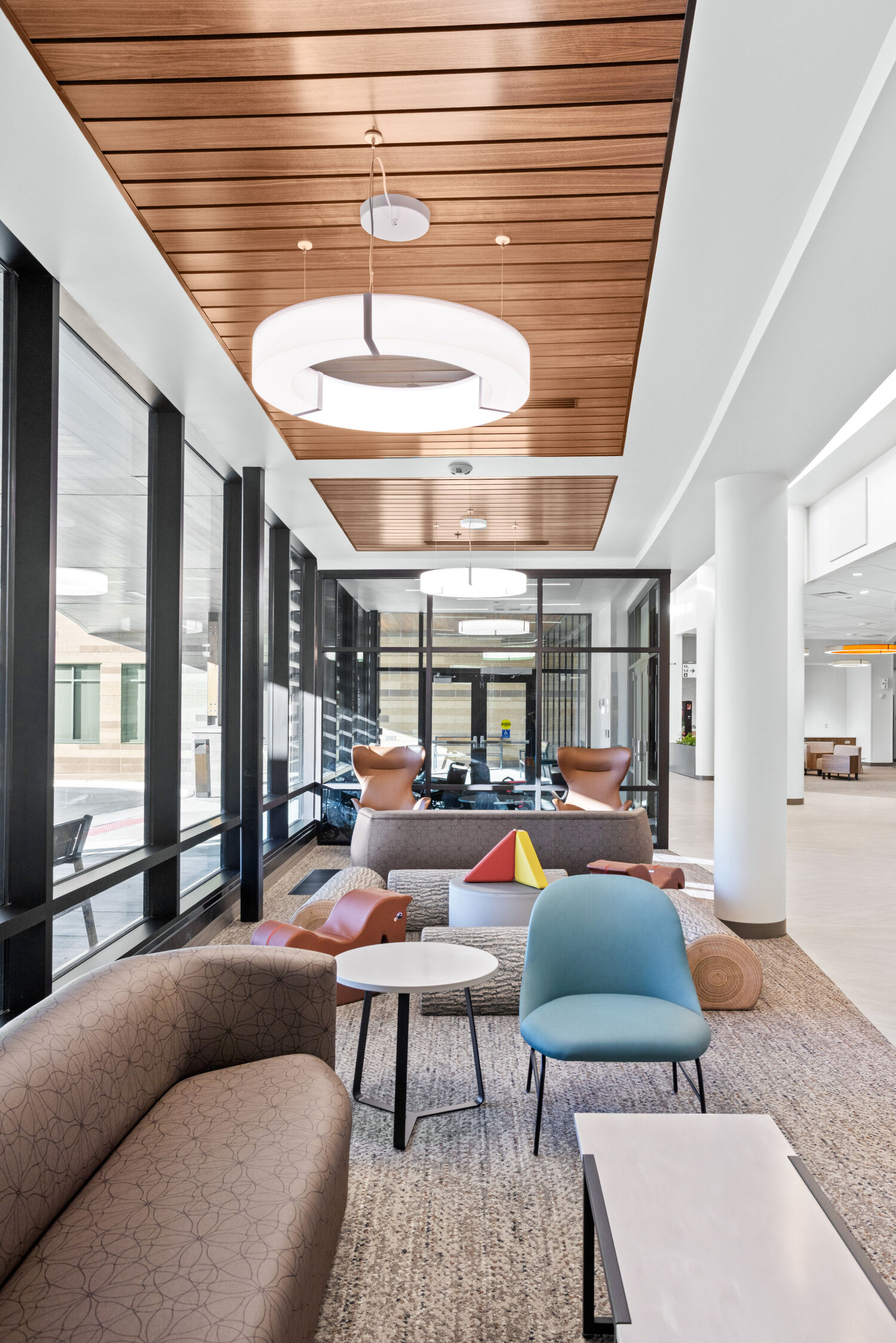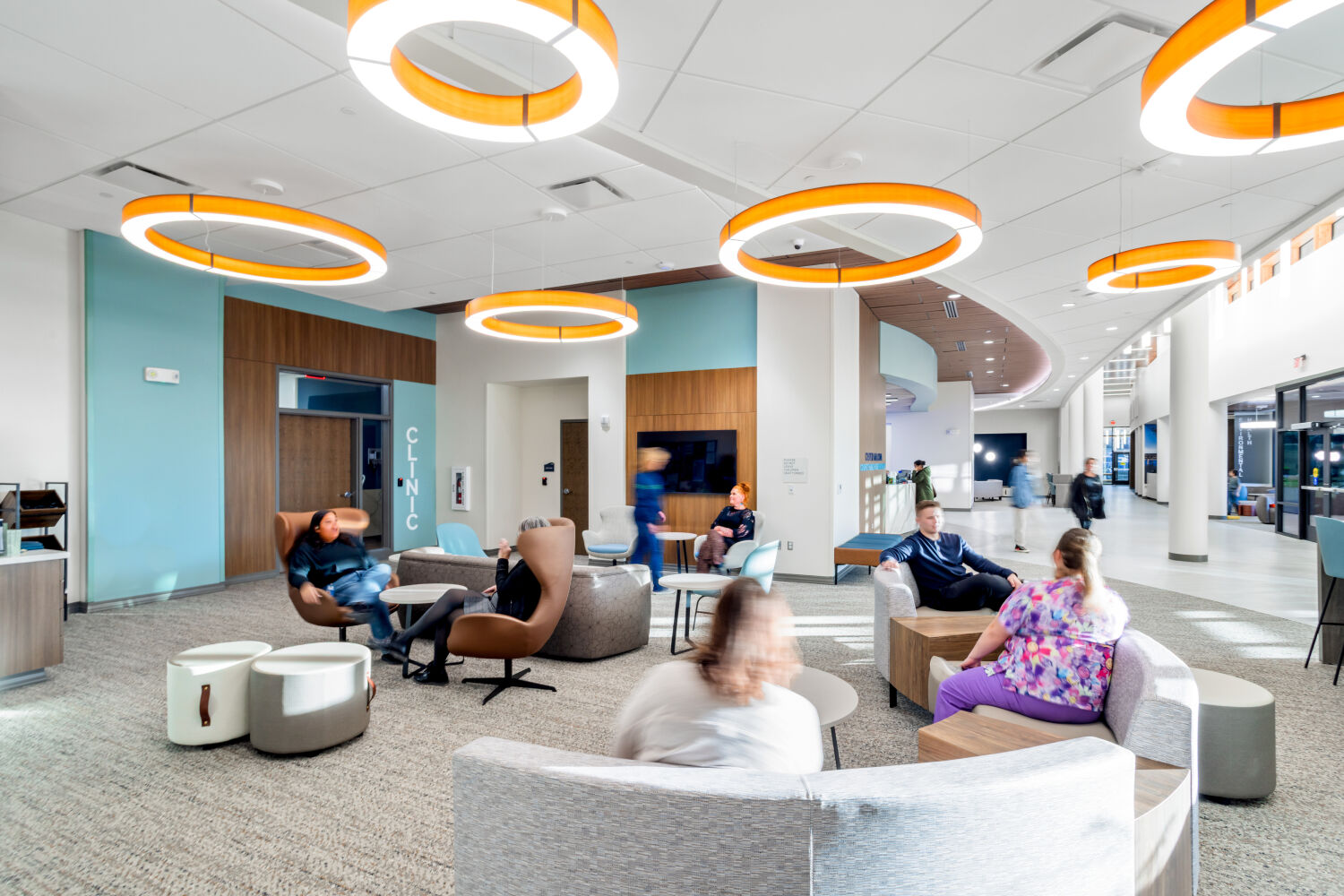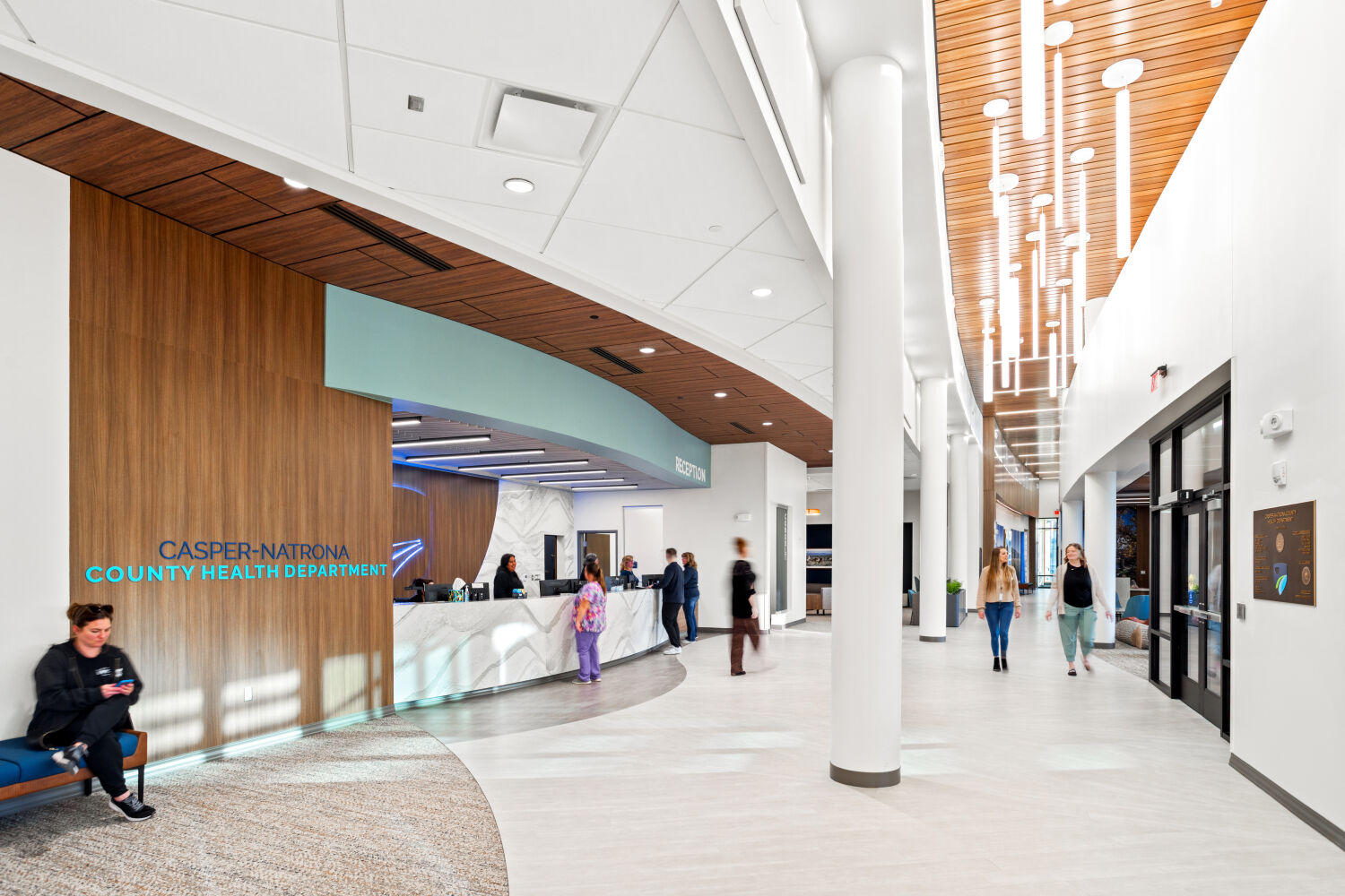 Waiting area at the Casper–Natrona County Health Department with circular lounge seating, upholstered chairs, low tables, and ring pendant lighting.