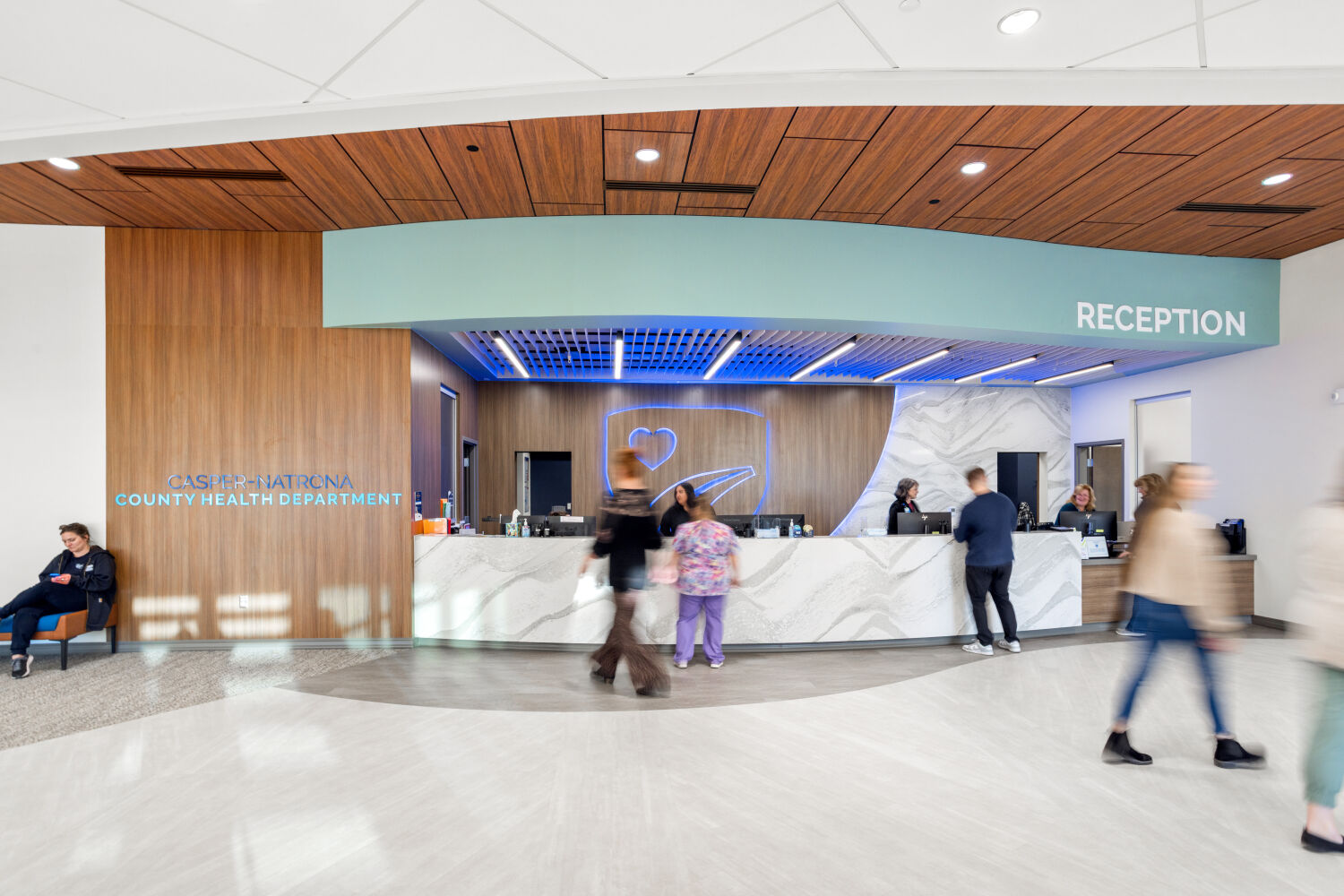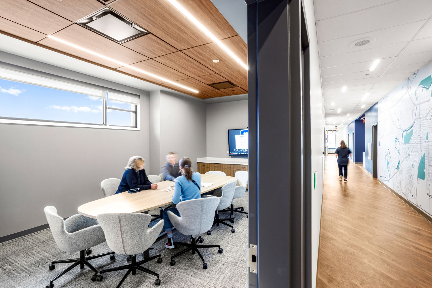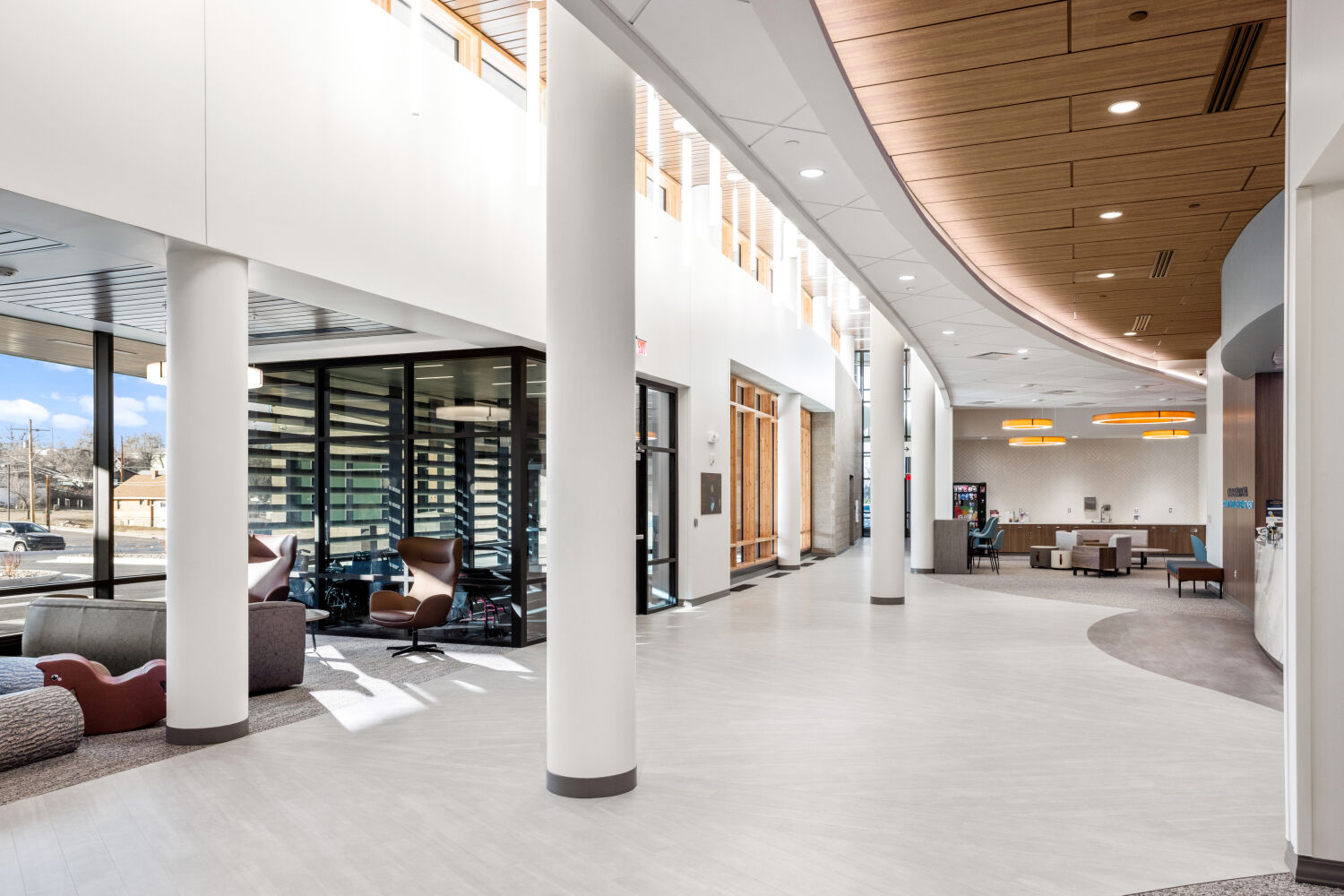 The sweeping form of the building responds to Casper’s southwest winds, guiding visitors along a clear central spine. Natural light anchors corridors and workspaces, while biophilic materials and colors reinforce wellbeing and connection to place. Flexibility was built into the plan, allowing new services such as the Natrona County Women, Infants, and Children (WIC) Program to be integrated during construction without disrupting progress.