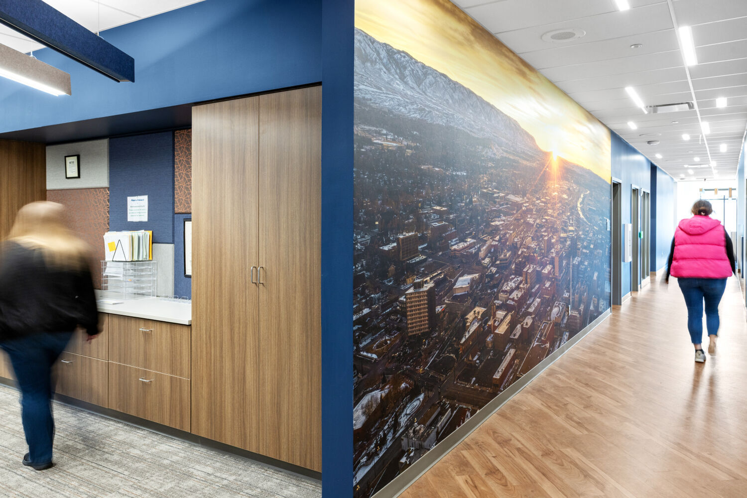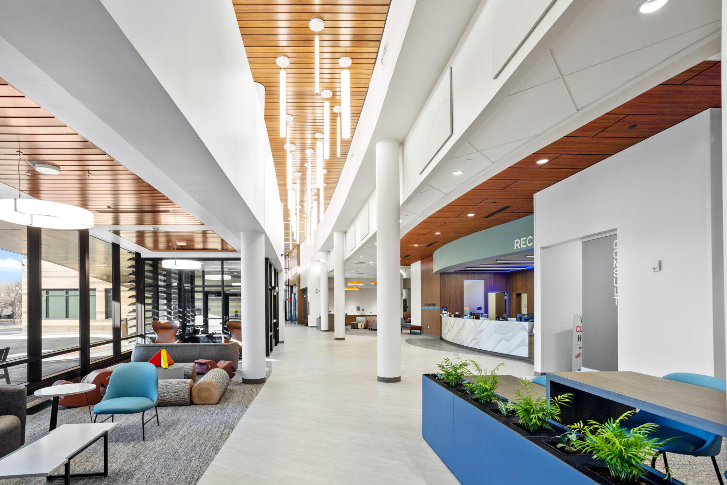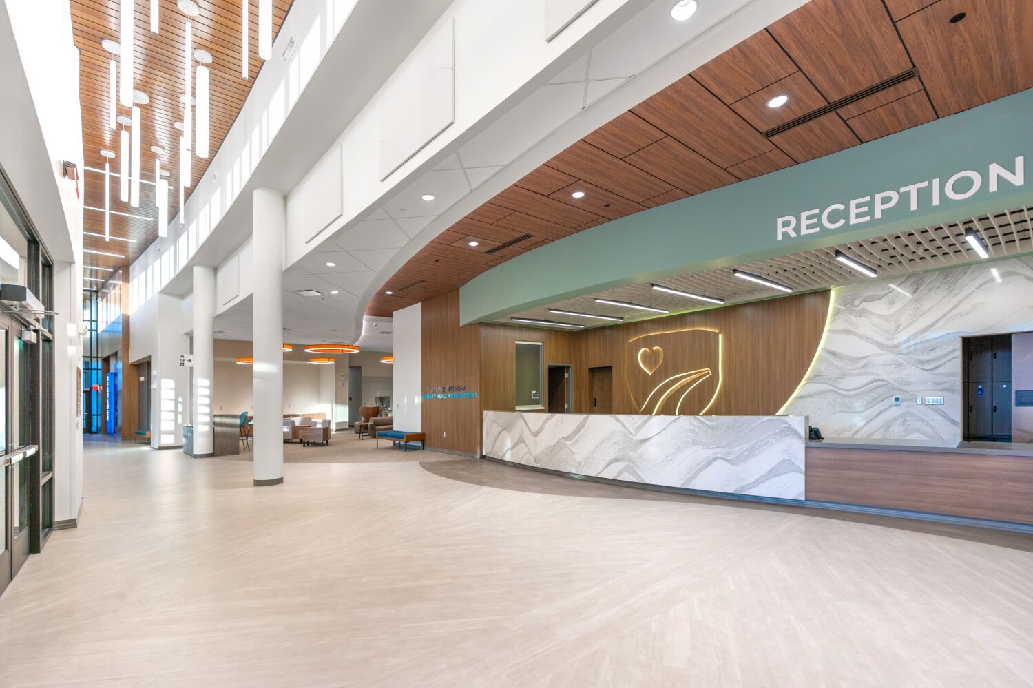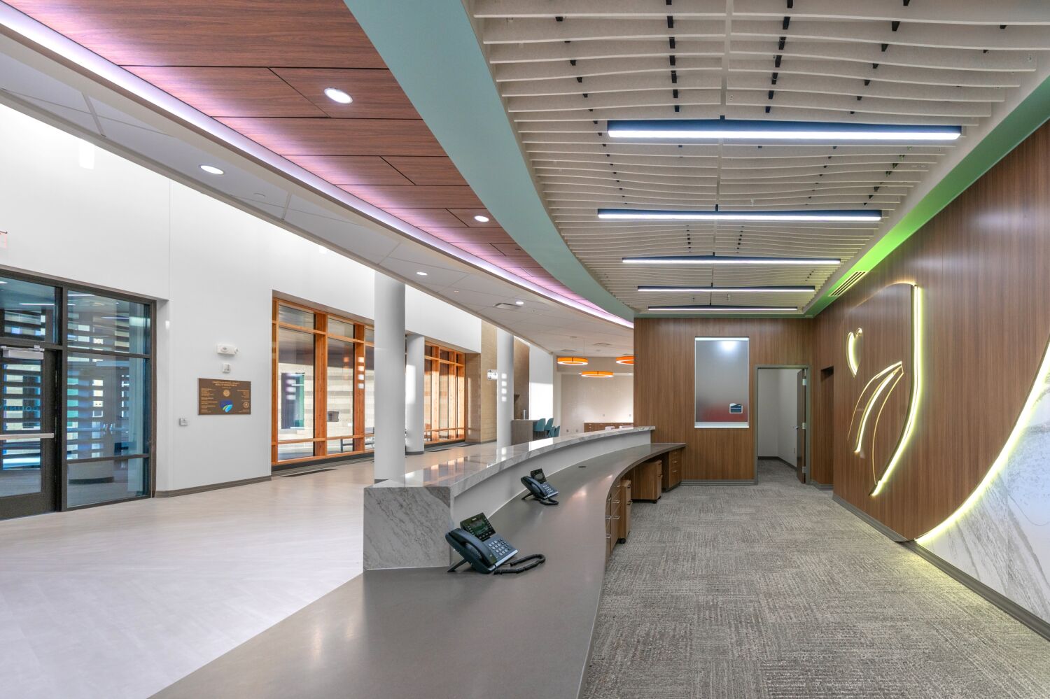 The sweeping form of the building responds to Casper’s southwest winds, guiding visitors along a clear central spine. Natural light anchors corridors and workspaces, while biophilic materials and colors reinforce wellbeing and connection to place. Flexibility was built into the plan, allowing new services such as the Natrona County Women, Infants, and Children (WIC) Program to be integrated during construction without disrupting progress.