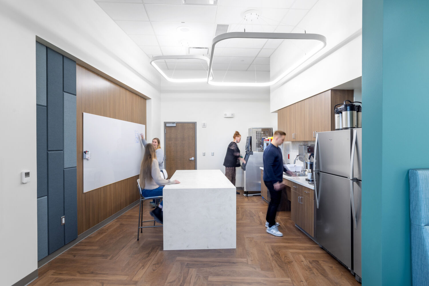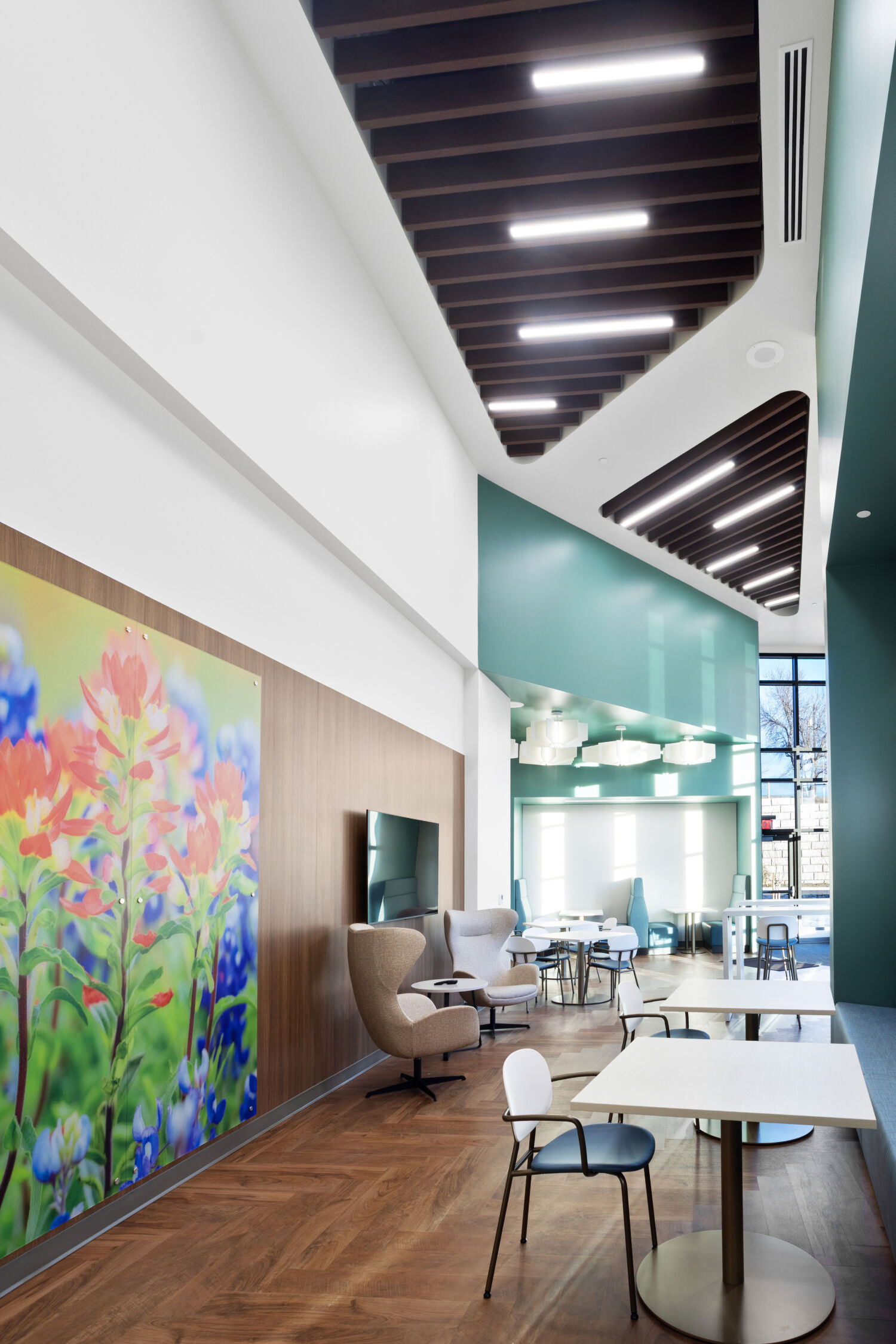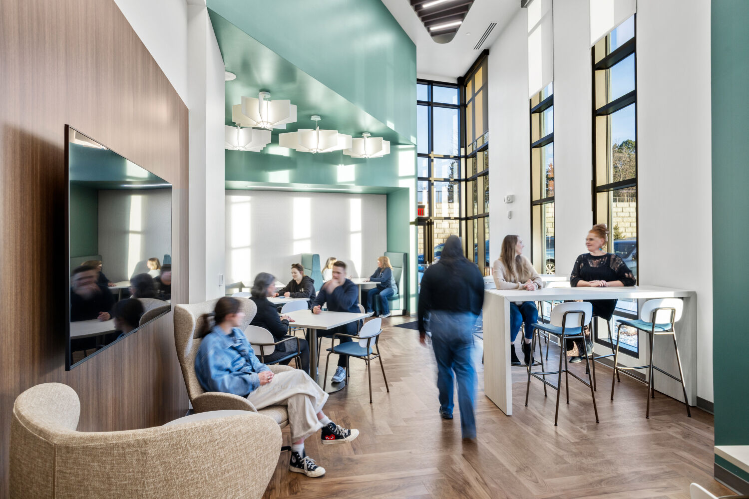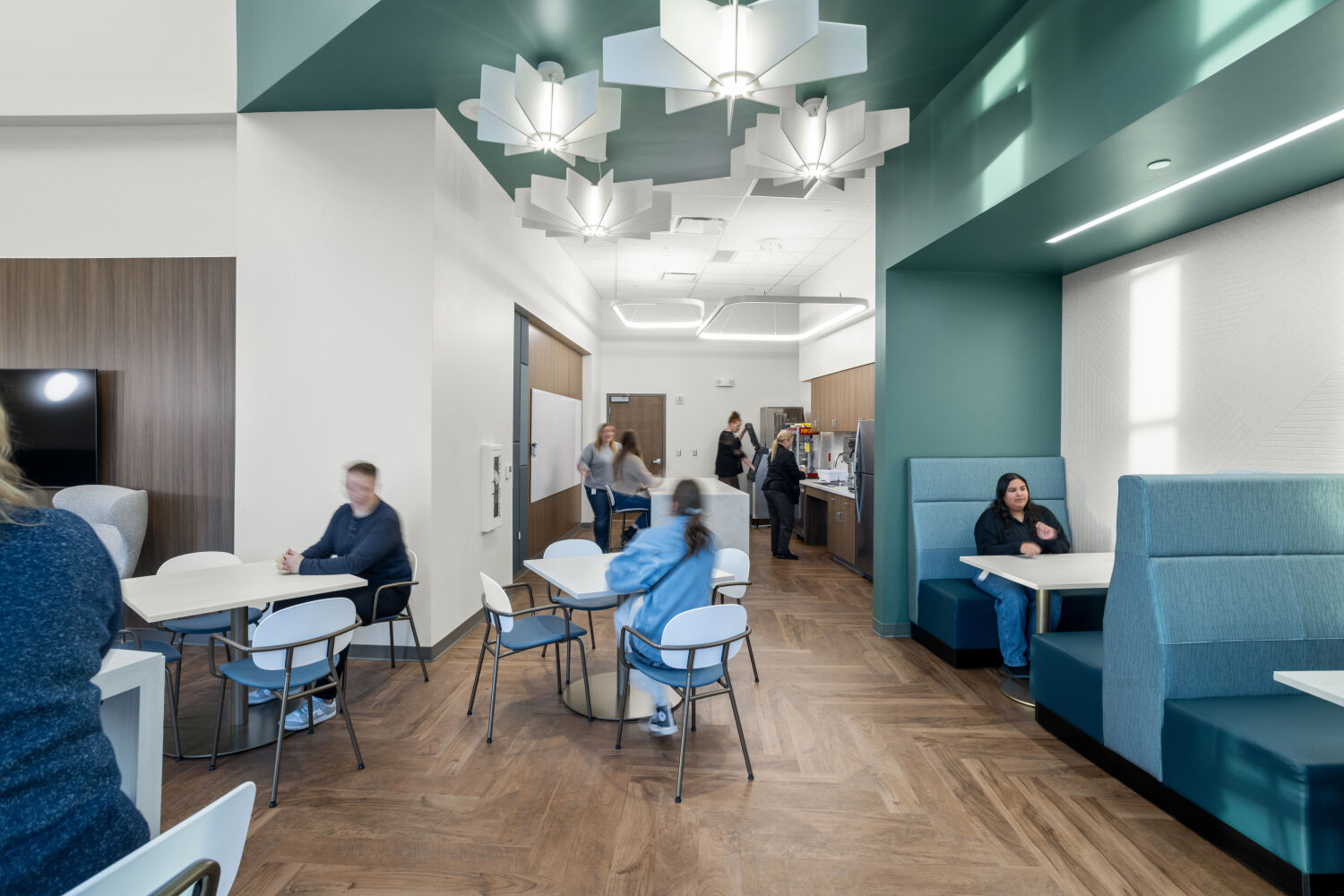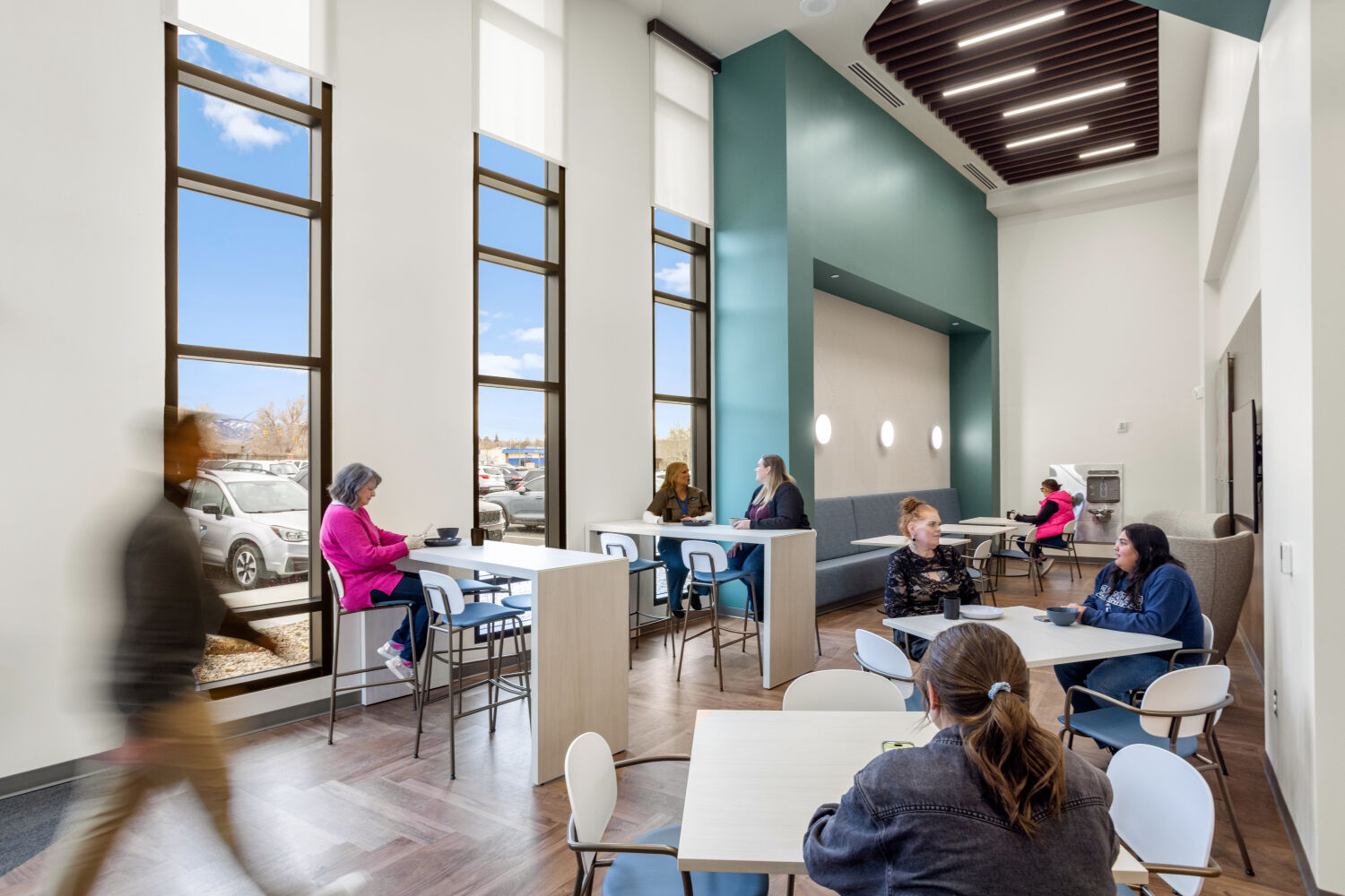 Staff lounge at the Casper–Natrona County Health Department with café tables, banquette seating, wood flooring, accent walls, and pendant lighting.
