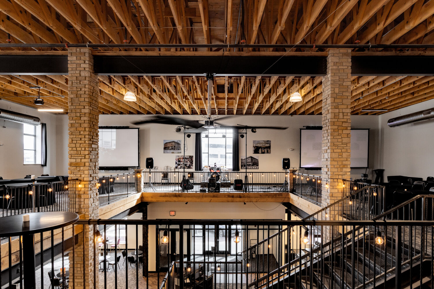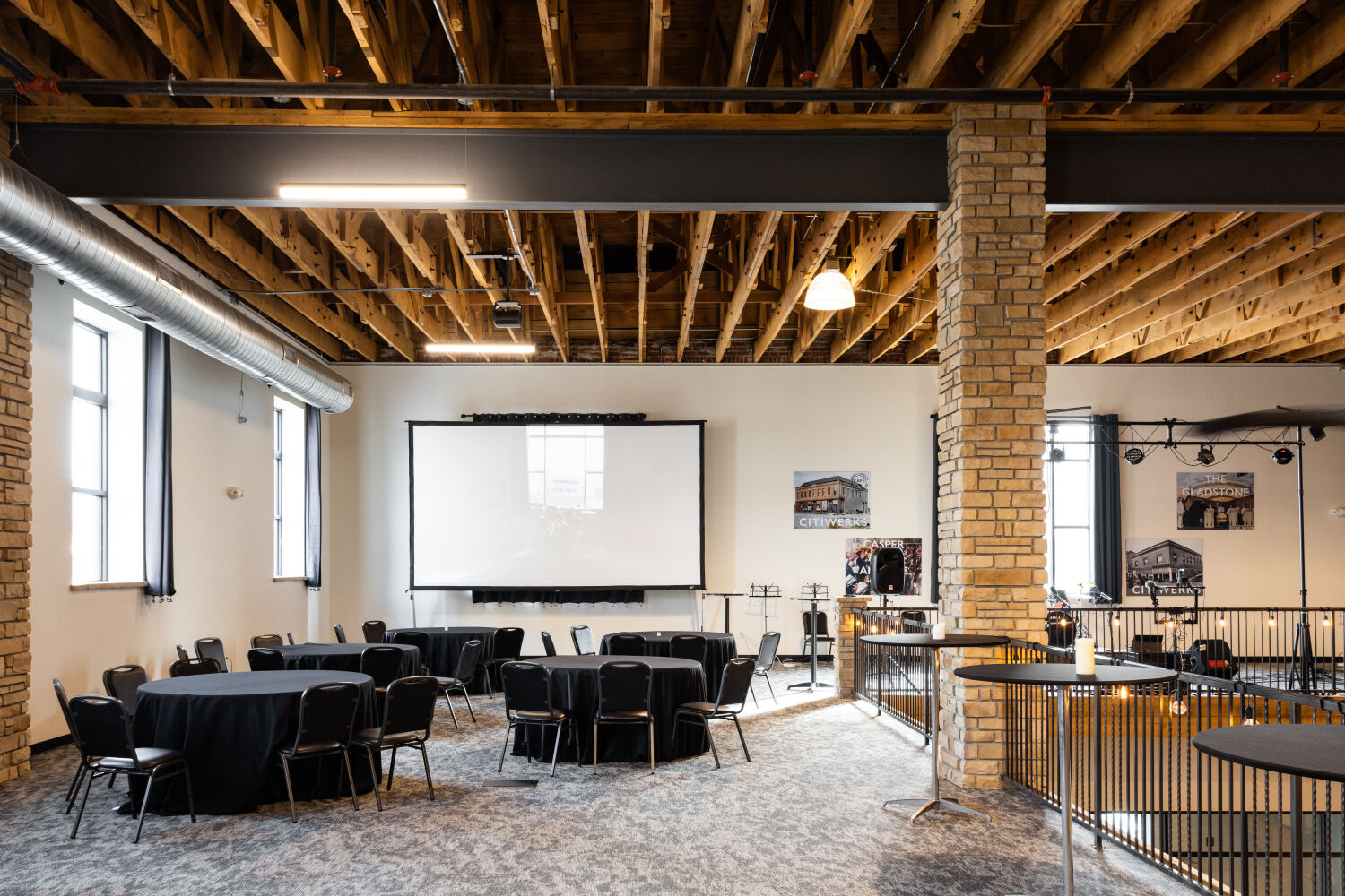 Casper Citiwerks mezzanine event space arranged with round tables and chairs, a projector screen, exposed wood ceiling beams, brick columns, and railing overlooking the coworking floor below.