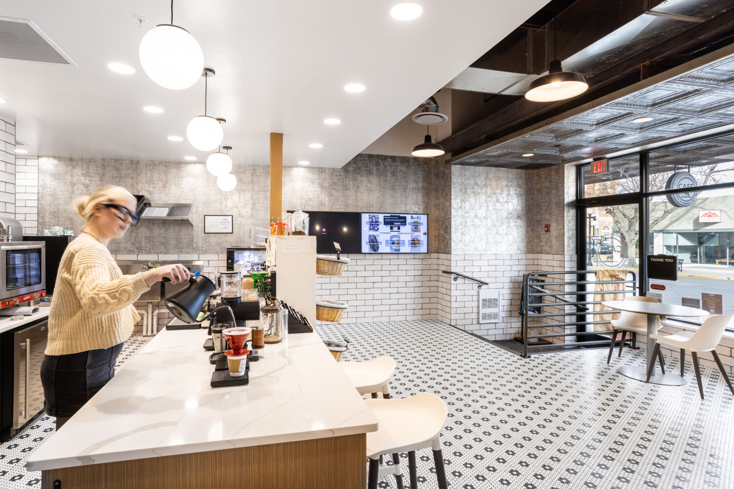 Citiwerks Café with a coffee counter, pastry display case, patterned tile floors, white brick walls, pendant lighting, and counter seating.