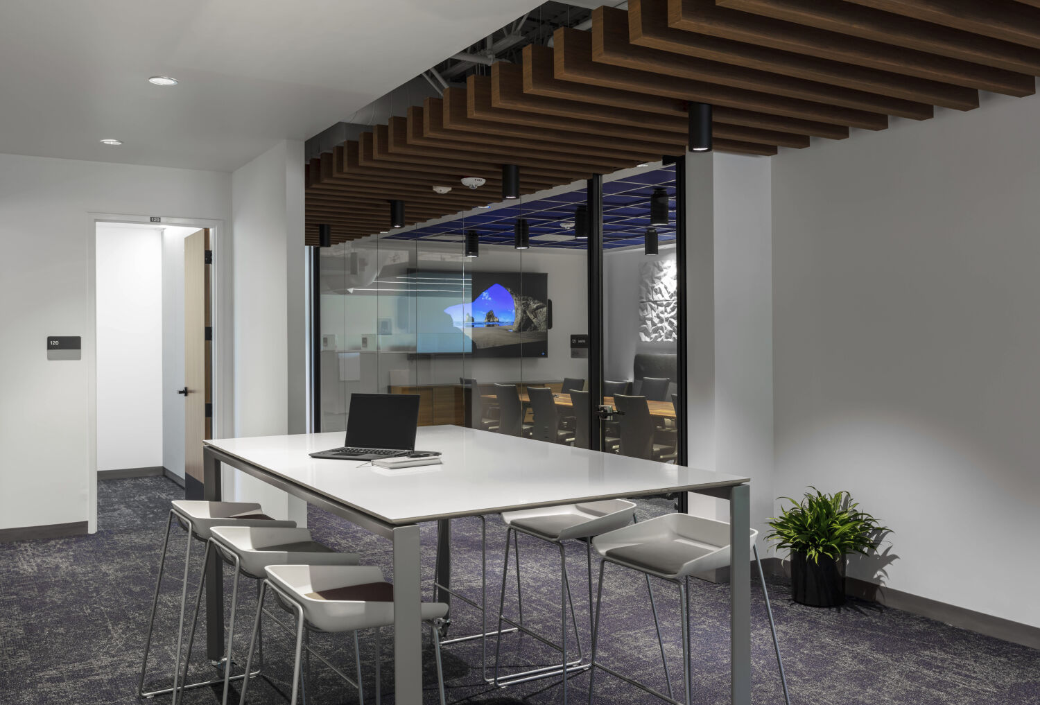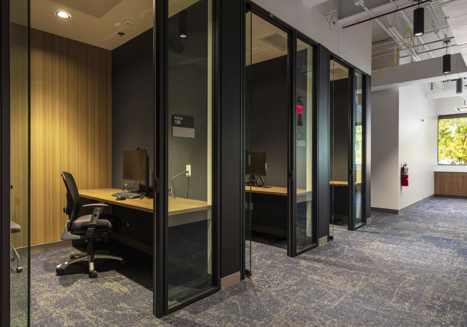 MOA ARCHITECTURE transformed multiple office tenant spaces in Boulder’s Pearl East Business Park into the new headquarters for Cogent Biosciences, a biotechnology company focused on genetically driven diseases. The renovation consolidates office, conference, and collaborative spaces centrally, while specialized laboratory spaces—including chemistry, enzymology, cellular biology, pharmacology, robotics, hydrogenation, nuclear magnetic resonance labs, and a vivarium—occupy the wings of the floor plate. The project also included major infrastructure upgrades, such as a full replacement of the HVAC system, a back-up generator, expanded water and electrical services, and an enlarged service yard.