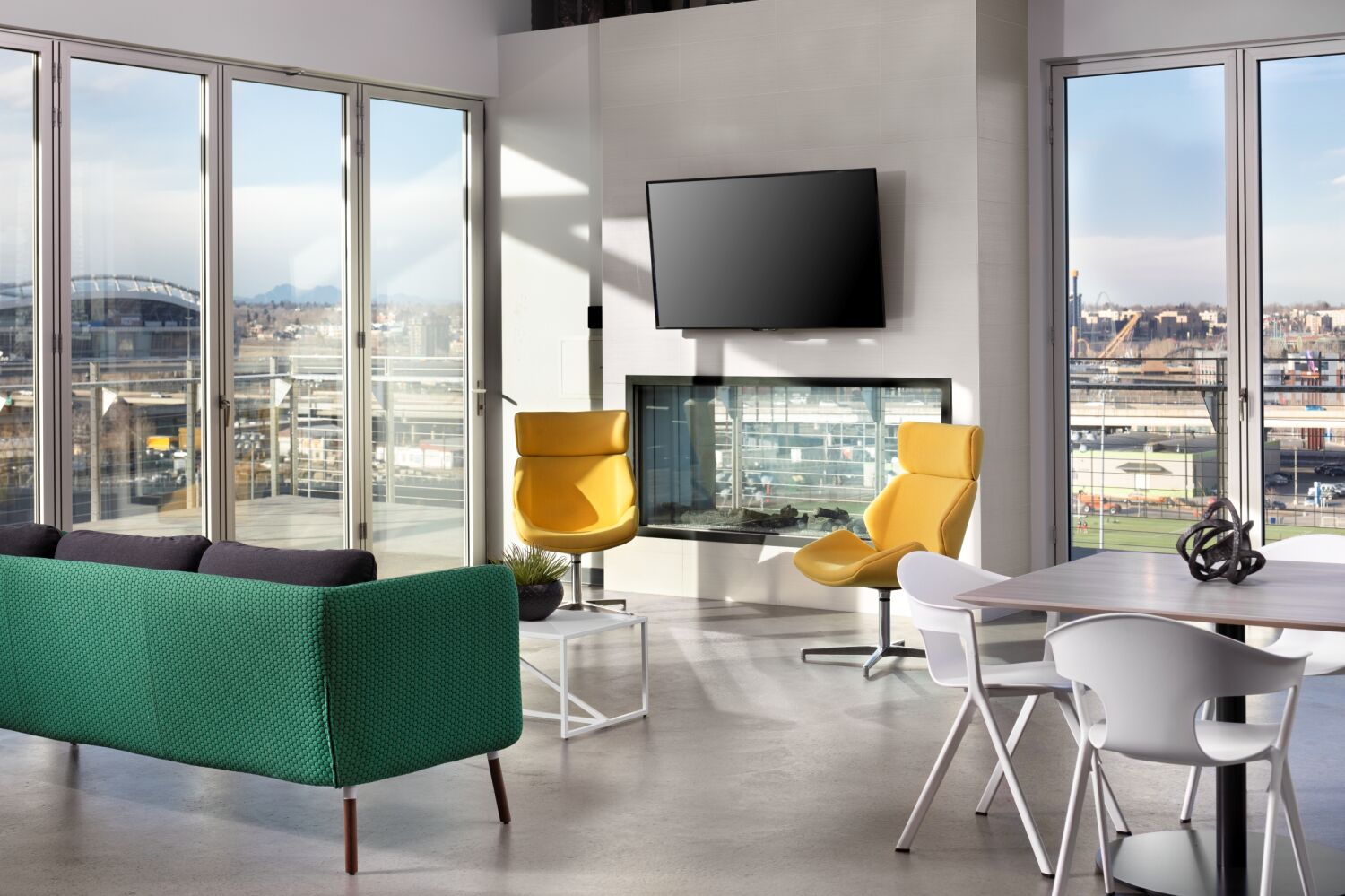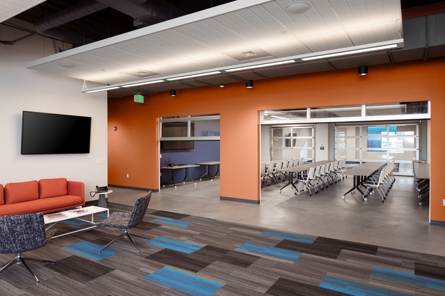 The design balances All Copy Products’ operational needs, corporate culture, and the site’s industrial context. The exterior features concrete forms, elegant metal paneling, and electrochromic glass, creating a rhythmic façade visible from Colfax Avenue that conveys movement and modernity. Because environmental covenants prevented below-grade parking, the design integrates a 220-space above-ground parking podium directly into the building massing, maintaining convenient access to offices, lobby, and warehouse spaces. Inside, the layout was carefully crafted to reflect the company’s collaborative culture, incorporating diverse work environments, huddle rooms, private spaces, and a guided “tour route” for prospective clients to experience the company’s products and services.