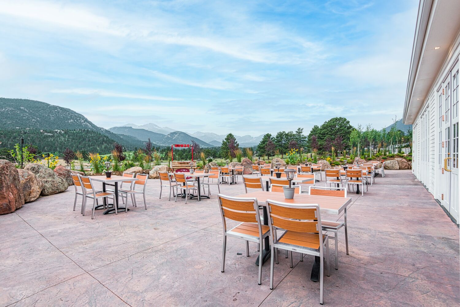 Exterior sign for The Post restaurant reading ‘THE POST CHICKEN & BEER,’ surrounded by rocks, greenery, and yellow flowers with The Stanle Hotel visible in the background.