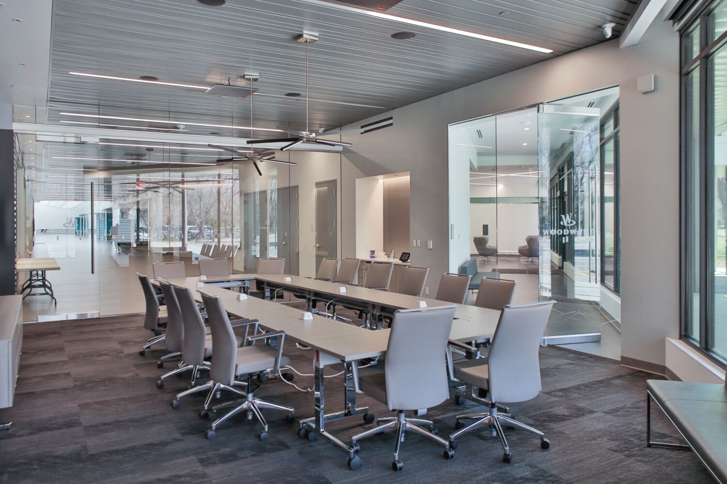 The Woodward Drake Corporate Campus serves as a design-to-manufacturing concept development site for Woodward, an independent provider of control solutions for aerospace and industrial markets. The campus renovation reimagined the facility to seamlessly integrate design, engineering, and manufacturing functions, creating a cohesive environment for innovation and production.