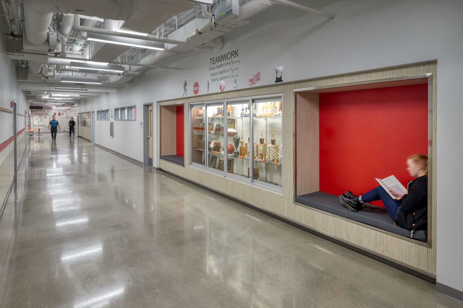 Corridor seating area with an orange bench and small tables in a recessed alcove, polished concrete flooring, exposed ceiling structure with red and white piping, and adjacent classrooms and display boards along the hallway.