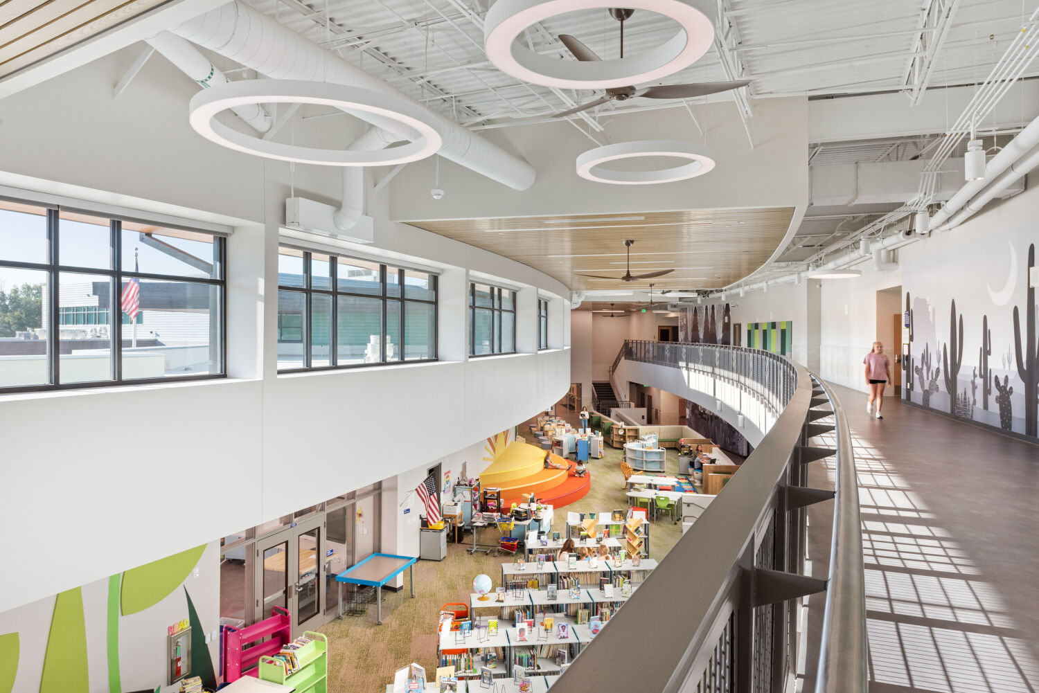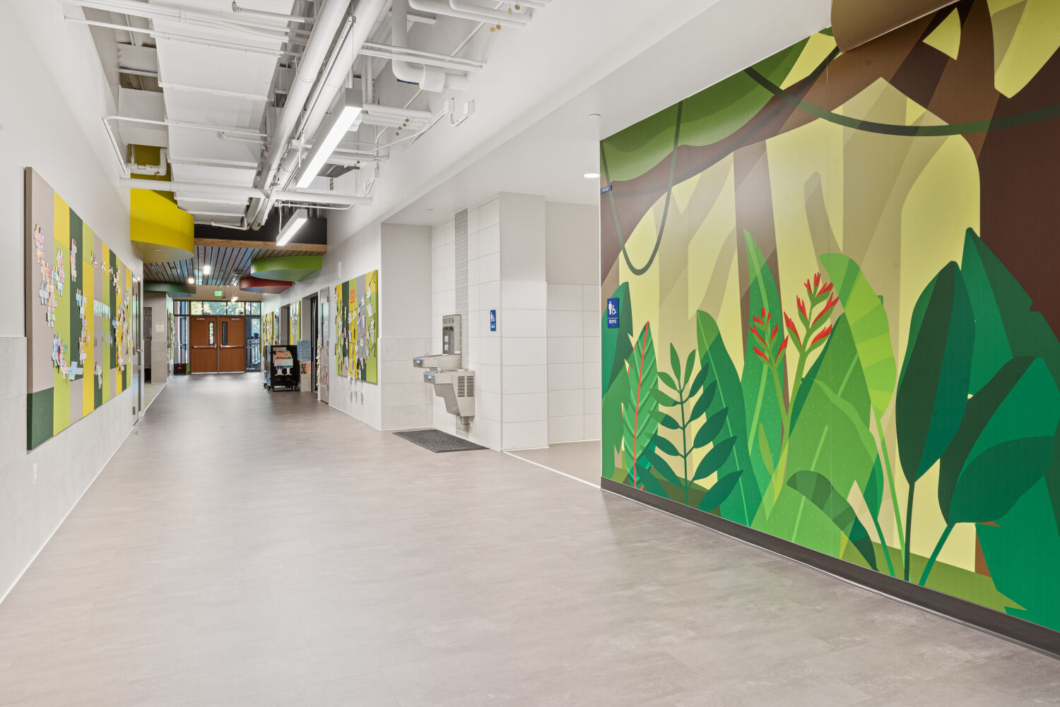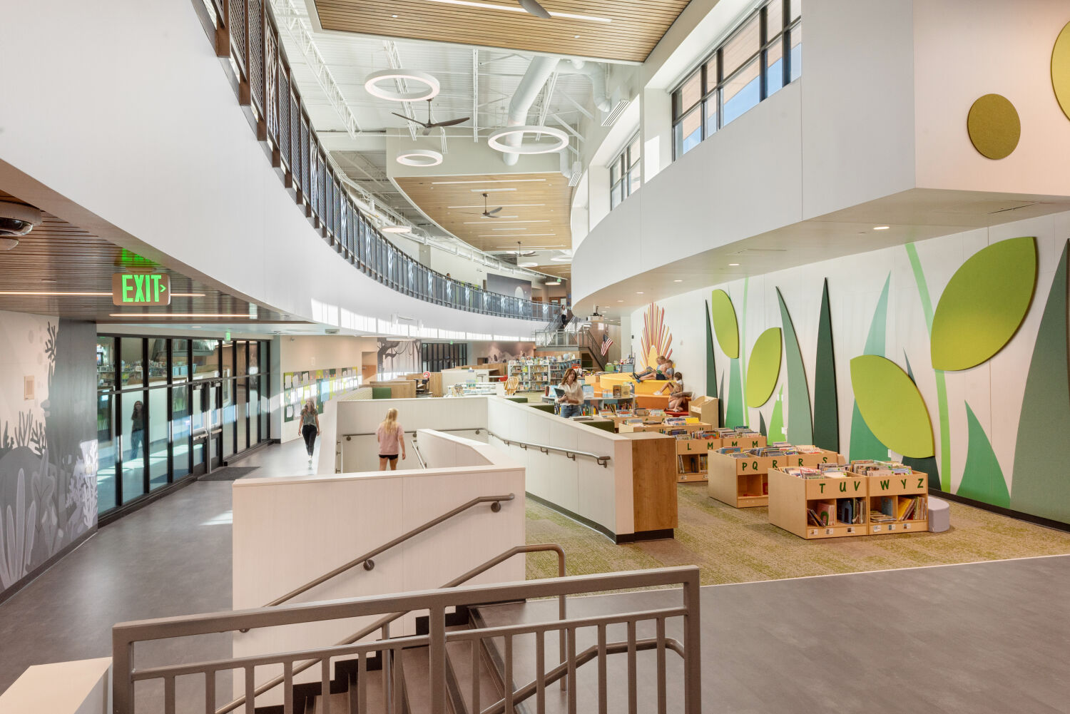 The design of Little Raven Elementary is rooted in the idea that learning flourishes when students feel connected to each other, their environment, and the broader world. Classroom pods are themed around Earth’s ecosystems, from rainforest to desert to ocean, creating immersive spaces that inspire curiosity and wonder. Input from families, educators, and community leaders shaped every decision, ensuring the school reflects the values and needs of its users. At the entry, a tree grows from the wall, its roots illustrated with imagery from cities worldwide, symbolizing unity, growth, and global connection. Throughout the design, indoor and outdoor spaces are woven together to create a seamless environment for exploration, collaboration, and play.