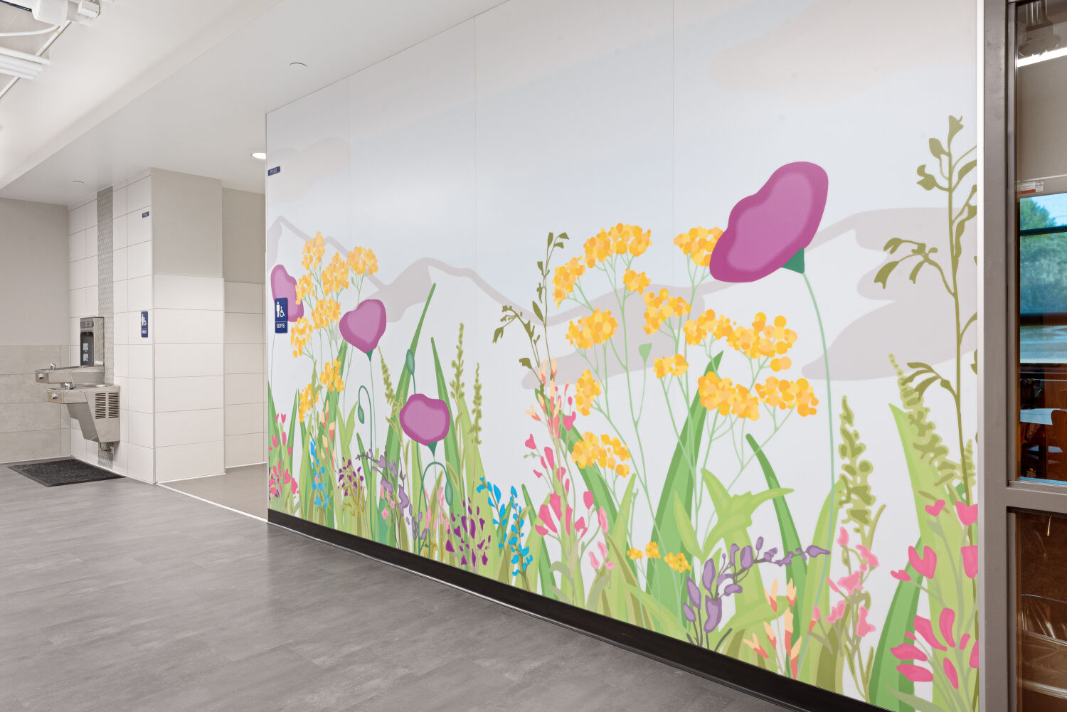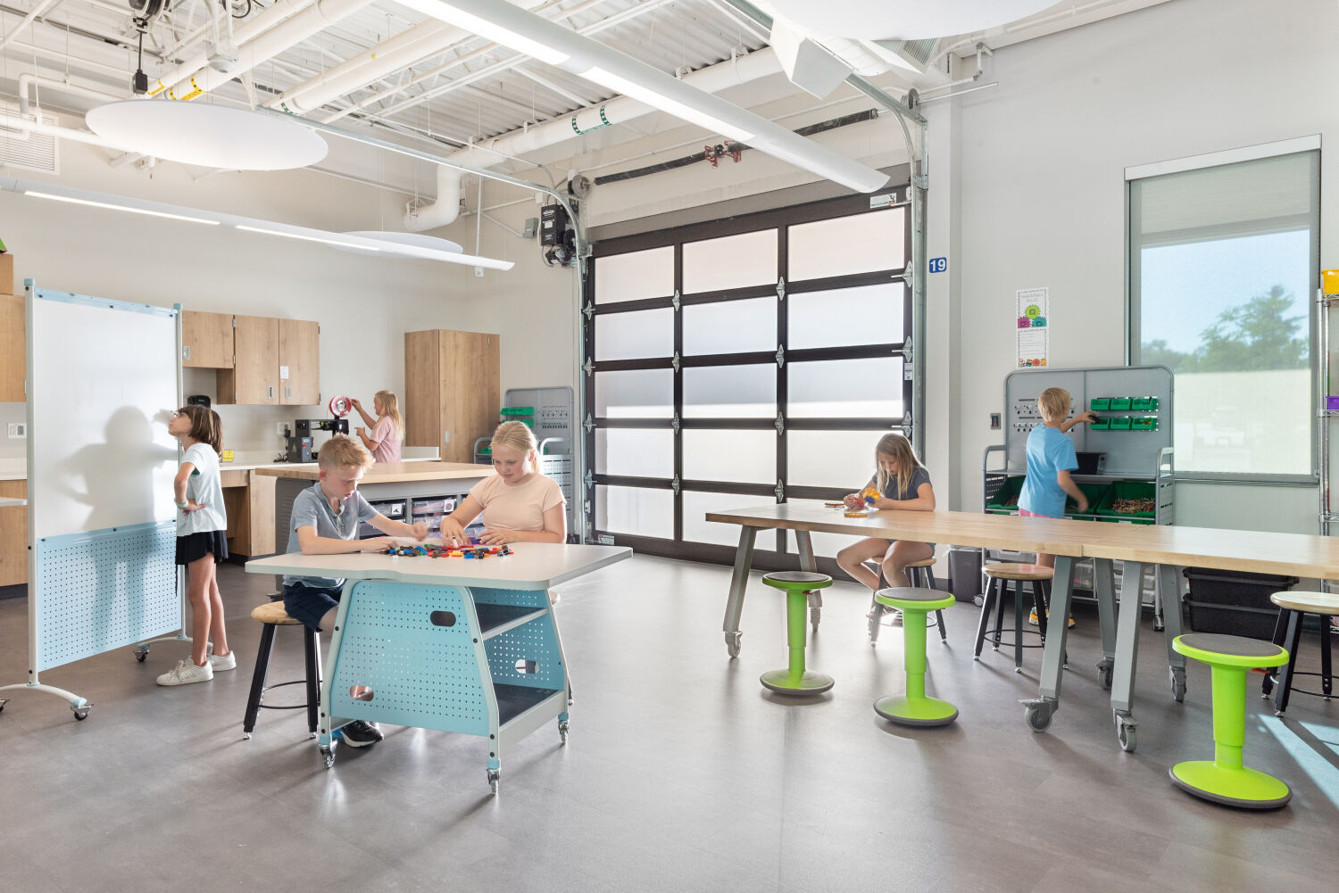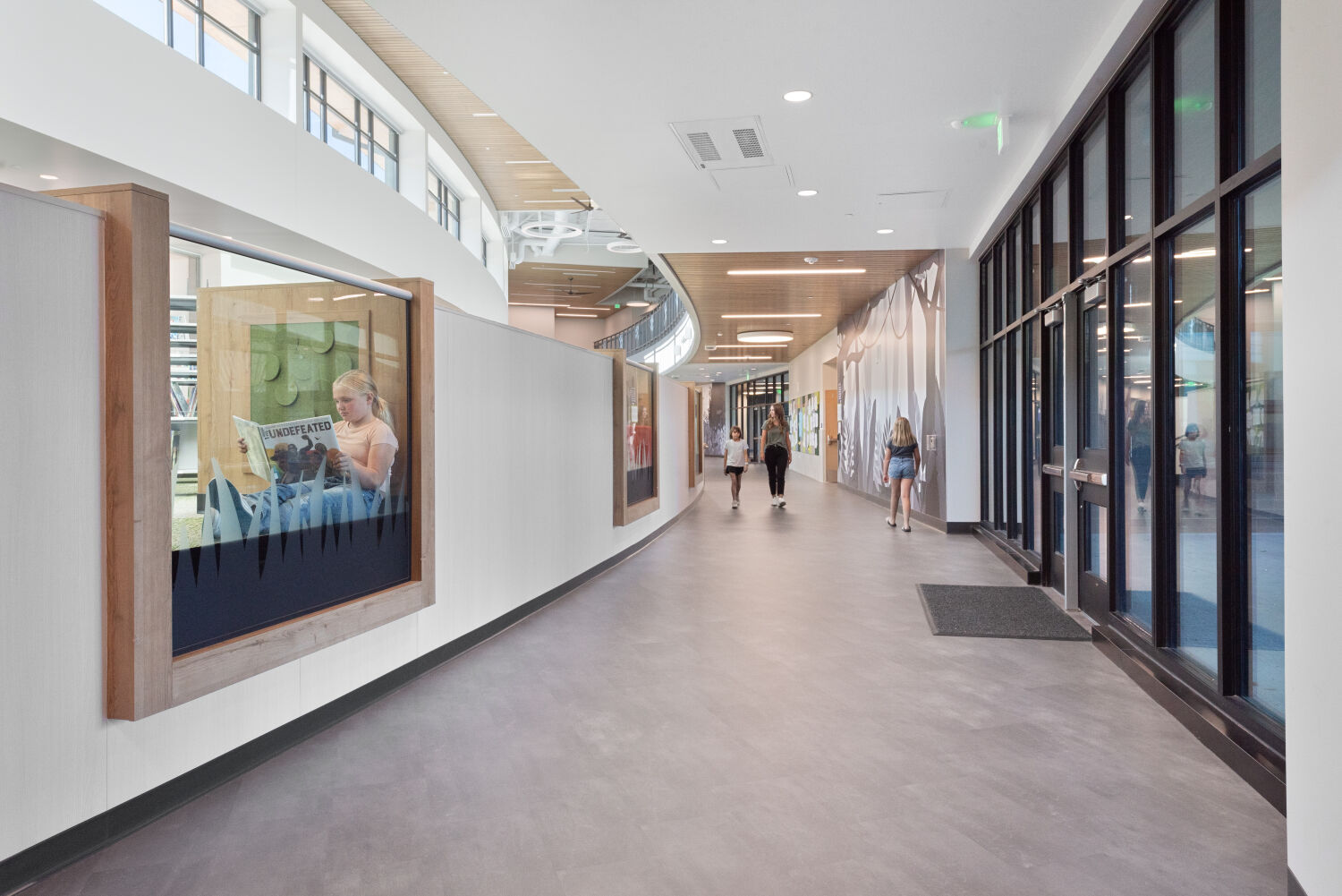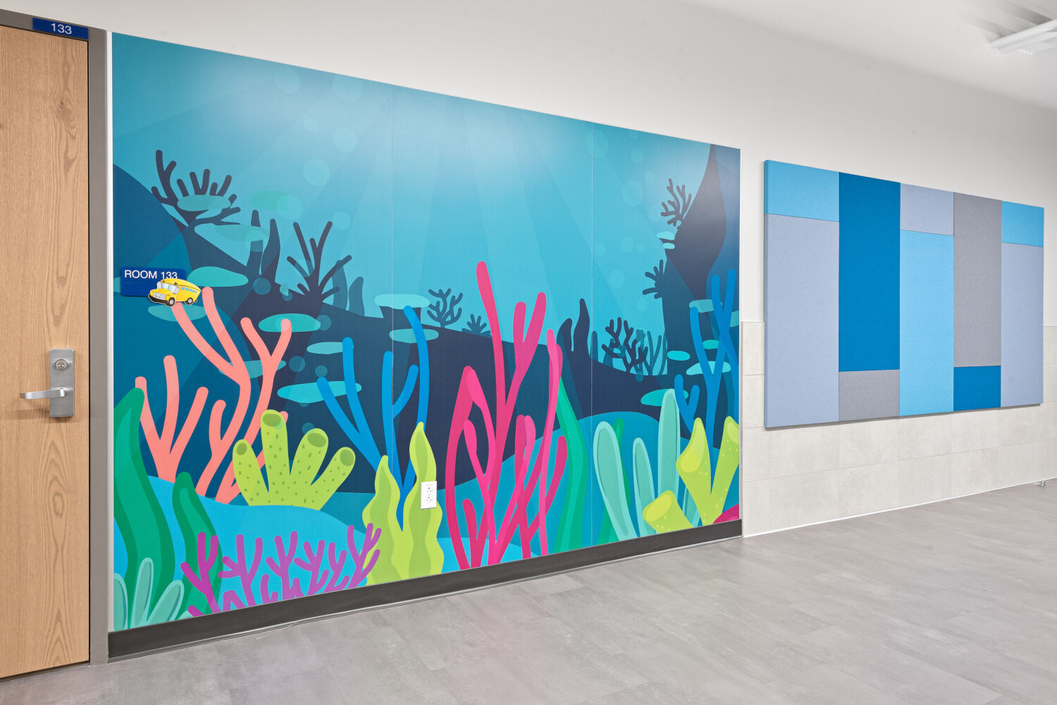 The design of Little Raven Elementary is rooted in the idea that learning flourishes when students feel connected to each other, their environment, and the broader world. Classroom pods are themed around Earth’s ecosystems, from rainforest to desert to ocean, creating immersive spaces that inspire curiosity and wonder. Input from families, educators, and community leaders shaped every decision, ensuring the school reflects the values and needs of its users. At the entry, a tree grows from the wall, its roots illustrated with imagery from cities worldwide, symbolizing unity, growth, and global connection. Throughout the design, indoor and outdoor spaces are woven together to create a seamless environment for exploration, collaboration, and play.