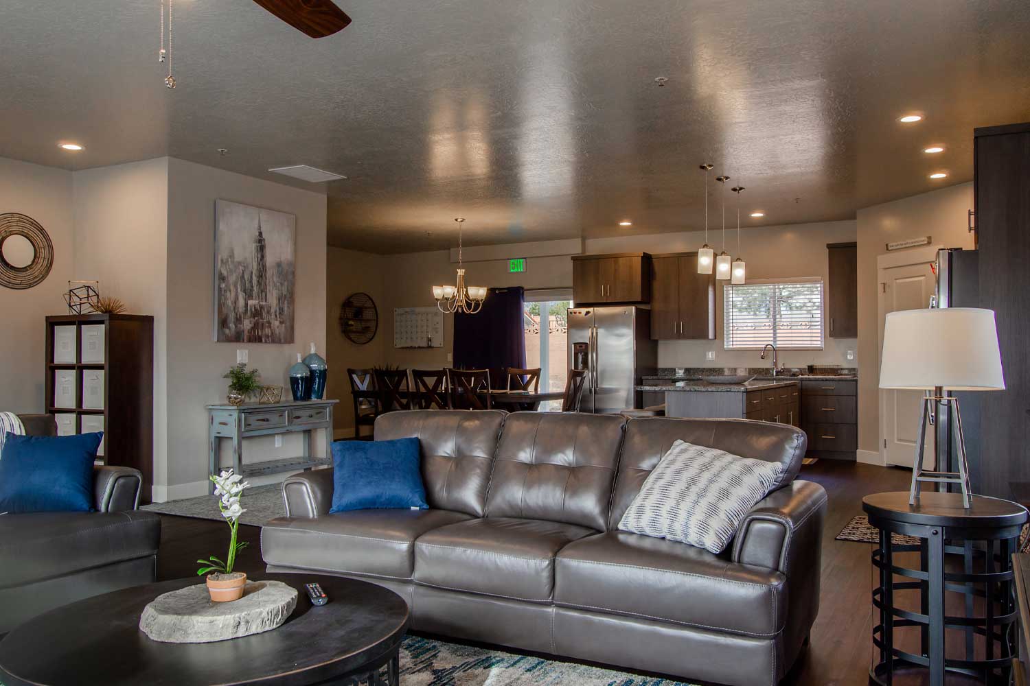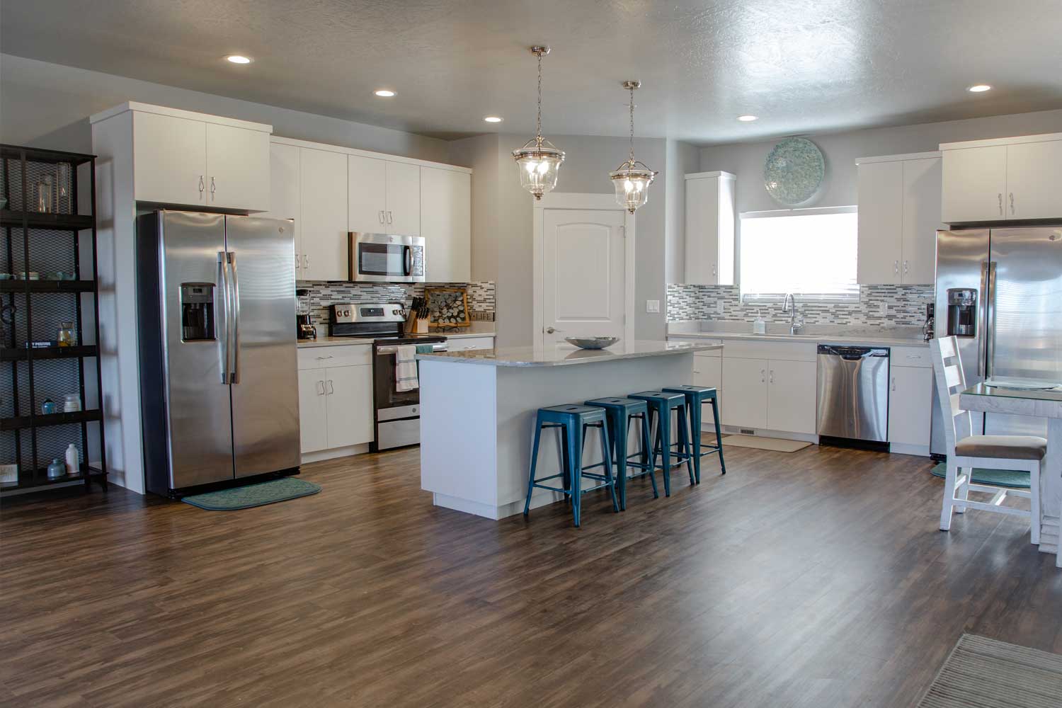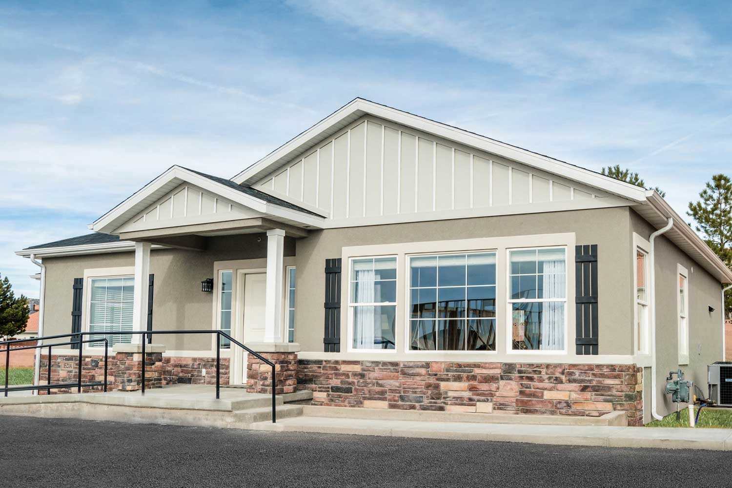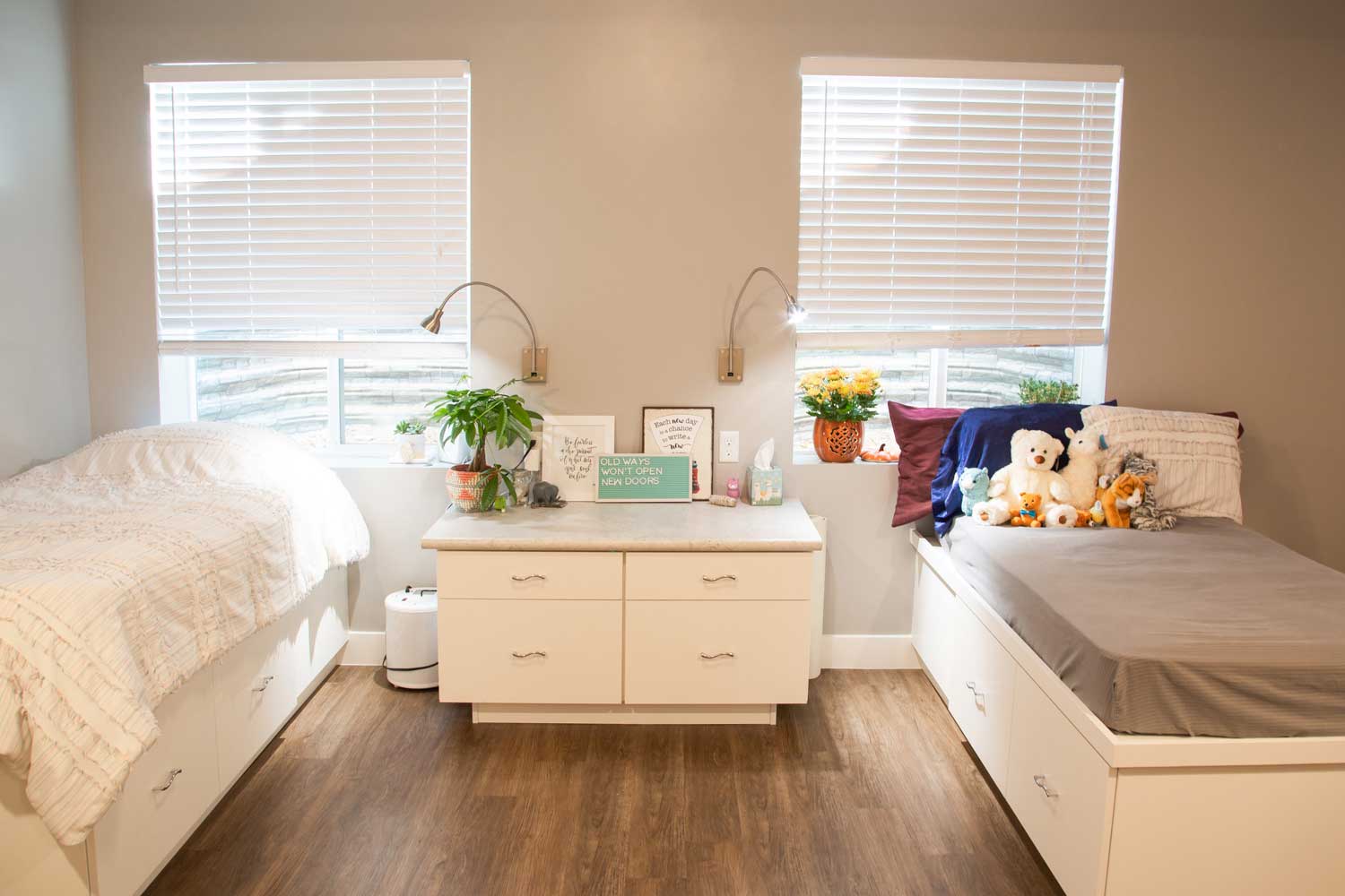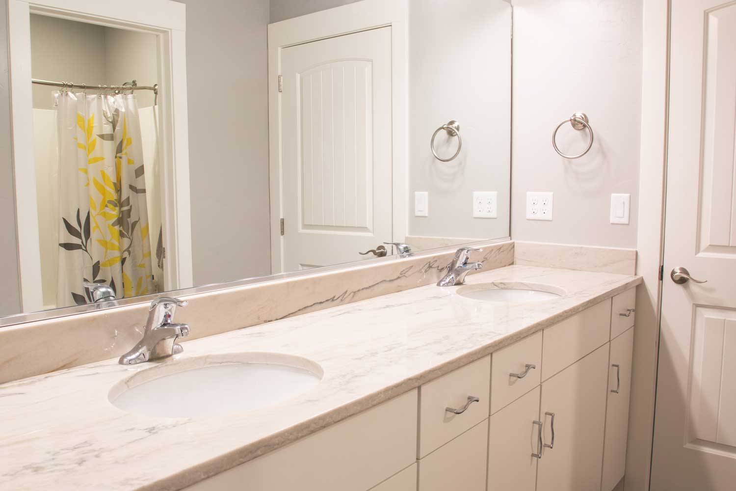 A collection of two homes built for group living on campus. These homes are not only beautiful, they are durable and built to withstand the rigors of teenagers. Of course, they’ve been independently tested and inspected and have earned a great HERS Index score. We use only certified low VOC (volatile organic compounds) products for fresh, clean, healthy air. The floors are waterproof and scratch resistant, the counters are granite, and the exterior needs very little maintenance. Downstairs, bathrooms are built to accommodate four teenagers getting up at the same time and to provide each with their own privacy. With good design, the house easily accommodates wheelchair accessibility while looking good too.
