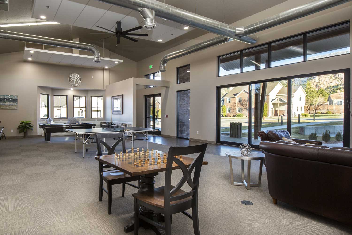 This new 6,356 square foot building on the Mountain Springs Preparatory Academy campus was built to inspire an active student population. The purpose driven design includes a music recording studio, art room for painting and pottery, multipurpose room for seminars, game room, reading nook, movie theater, kitchenette, plus indoor-outdoor gathering spaces, a double sided indoor-outdoor fireplace, and two sets of multiglide sliding glass doors. This spacious building design is very energy efficient with an amazing view!