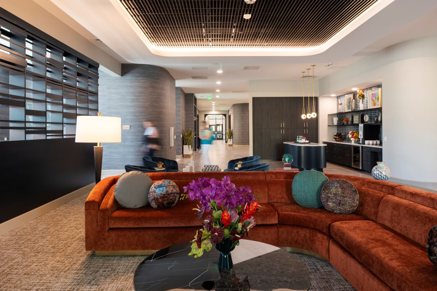 Lounge area with a curved upholstered sofa surrounding a modern linear fireplace, floral arrangement on a round coffee table, and seating arranged near a wall with horizontal slatted panels.