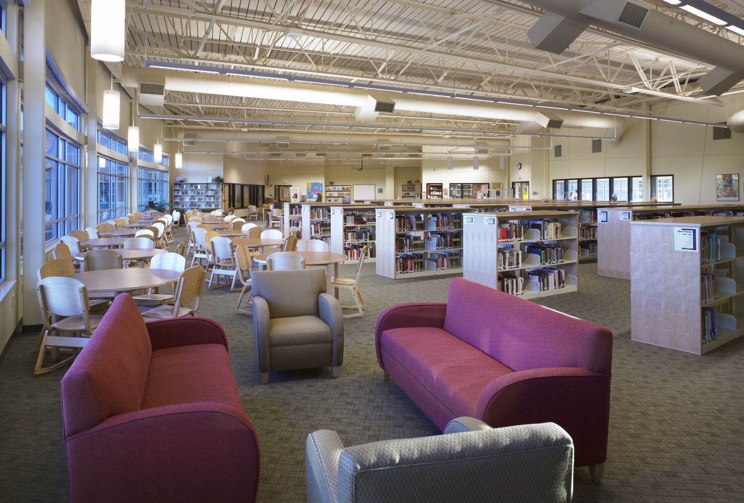 Library with rows of bookshelves, computer stations, wooden tables and chairs, lounge seating at the foreground, large windows along one wall, and an exposed ceiling with suspended lighting.