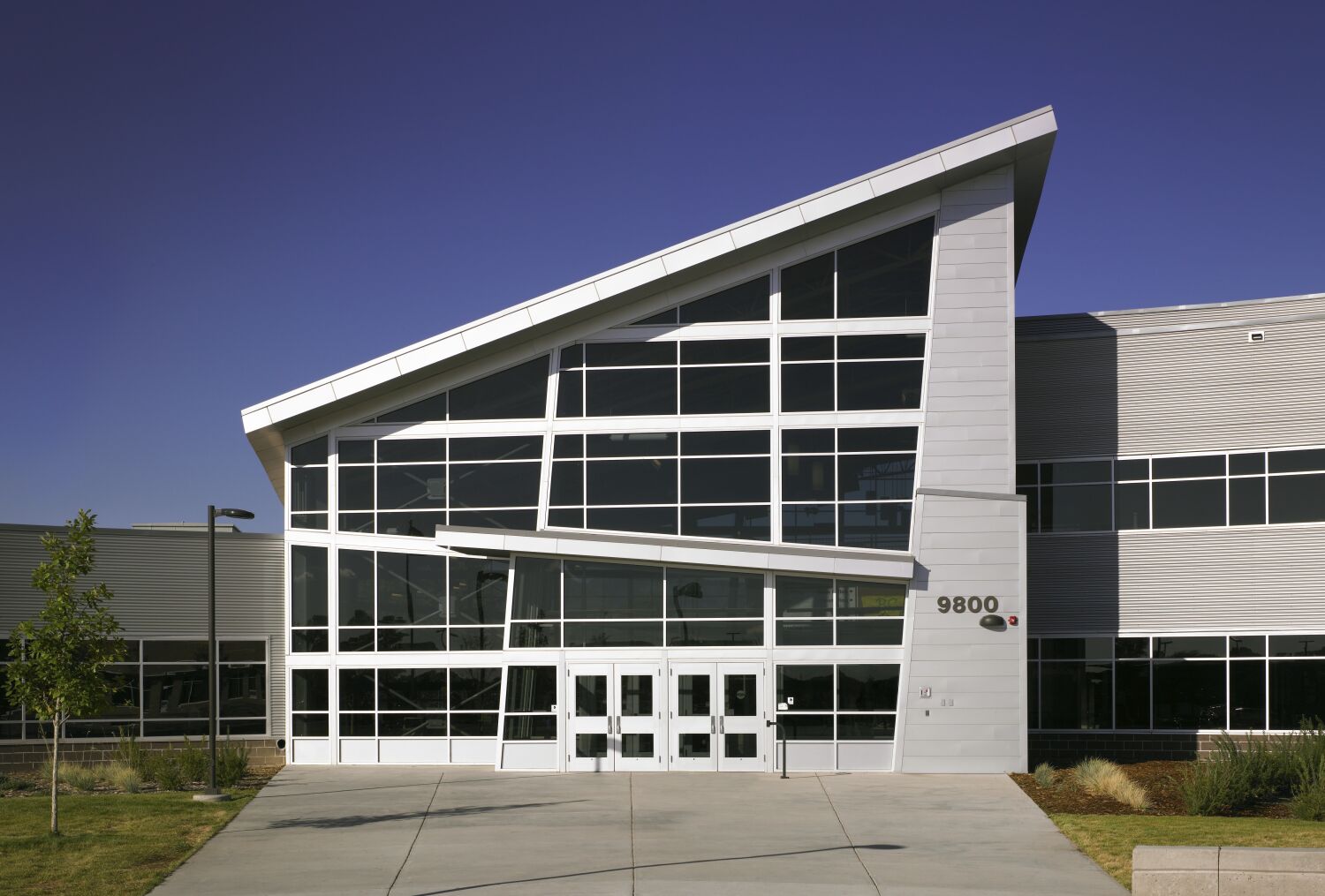 Exterior entrance of Bear Creek High School with a large glass façade, angled roofline, landscaped plantings, and a walkway leading to the main doors.
