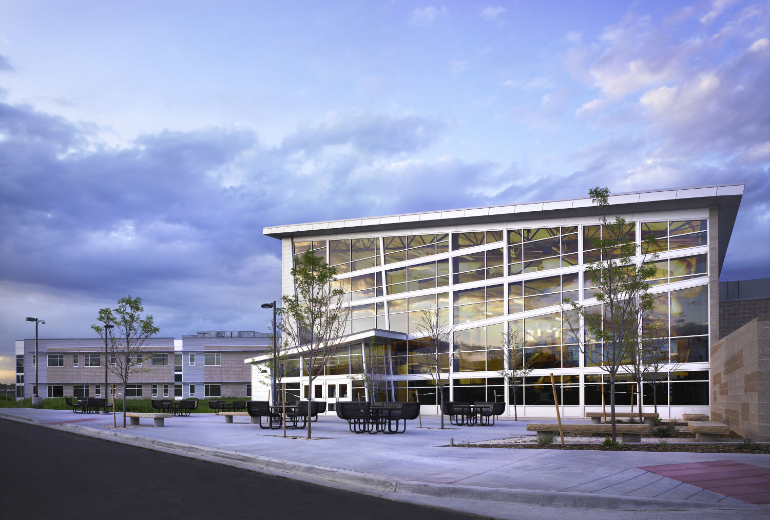The design of Bear Creek High School draws inspiration from university campuses, creating a sense of scale, community, and connectivity. A central pedestrian spine is framed by curved building walls, connecting students to classrooms, learning spaces, and a tree-lined promenade leading to the athletic fields plaza. The campus integrates vistas, green spaces, and formal and informal gathering areas, emphasizing the connection between indoor learning environments and the outdoors. Every design decision supports exploration, collaboration, and a diversity of academic and extracurricular experiences.