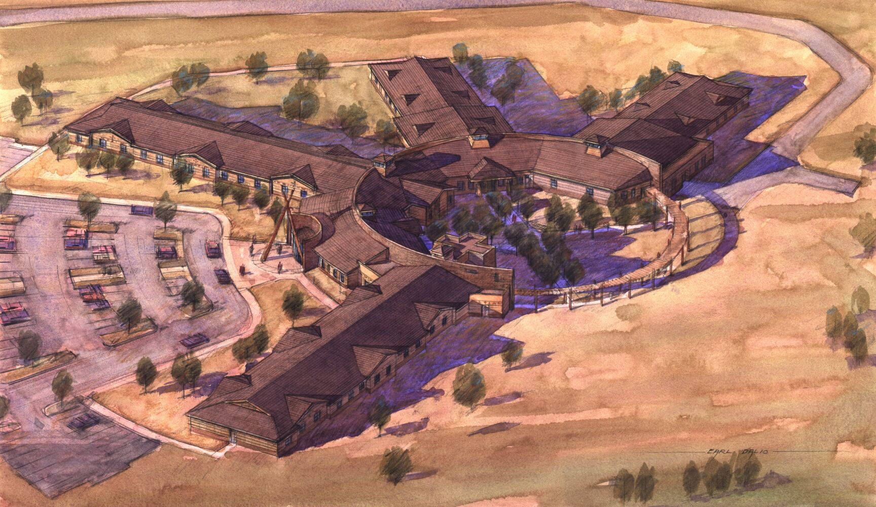 The Elderly Village in Eagle Butte, South Dakota, serves the elders of the Cheyenne River Sioux Tribe, providing a comprehensive skilled nursing and assisted living facility. The core facility includes 60 beds, with the potential to expand to 120, and offers spaces for admissions and orientation, health care, food service, visitation, programs, and administration. The design emphasizes functionality, comfort, and community for residents and staff alike.
