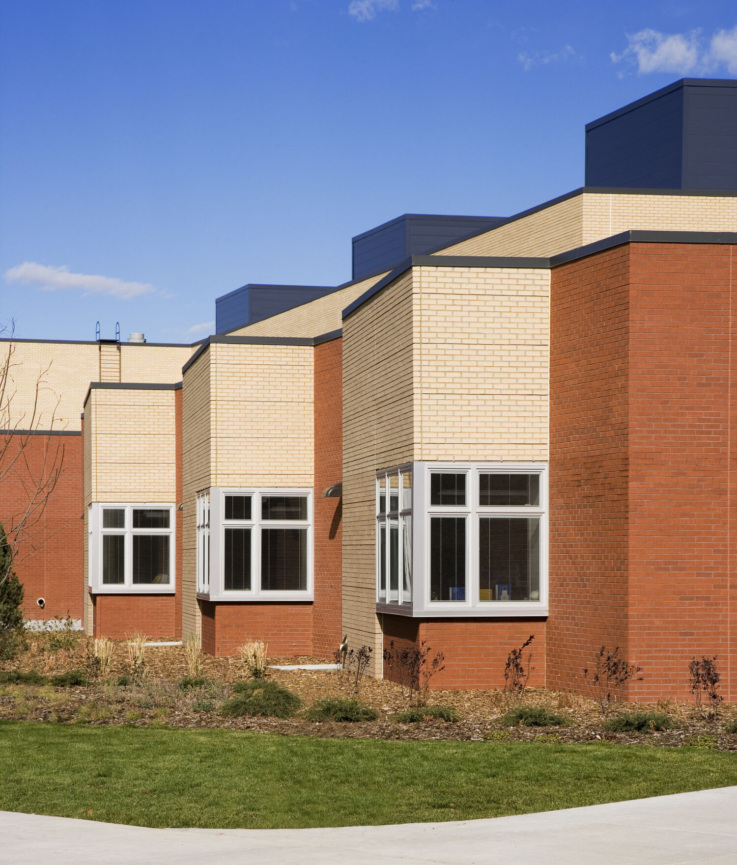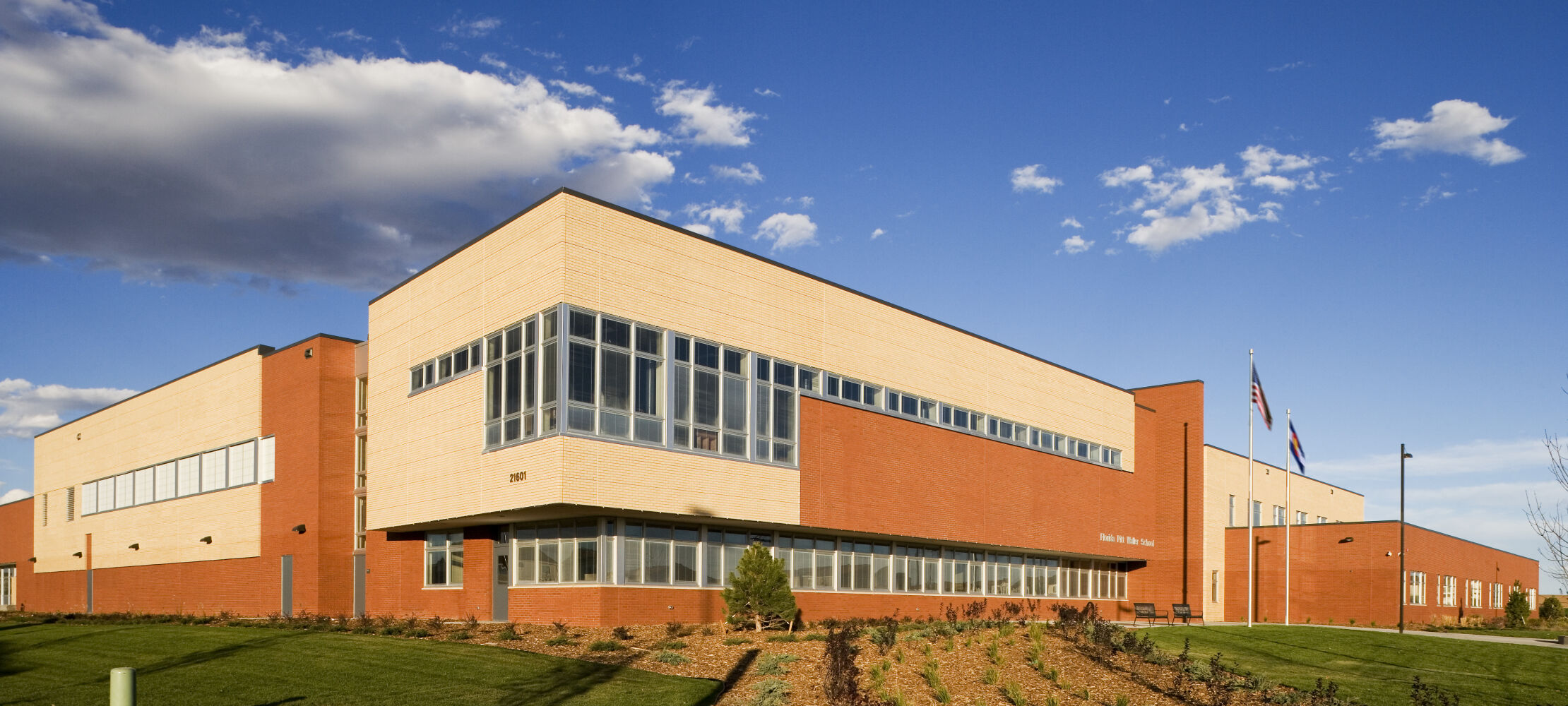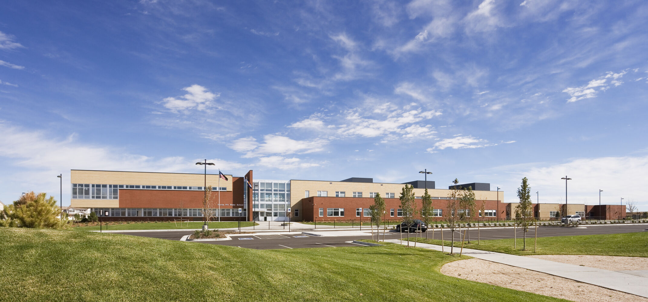 Florida Pitt Waller K‑8 School serves pre‑K through 8th grade students in Denver’s Green Valley Ranch community for Denver Public Schools. The school occupies a two-story building on a 12‑acre site, with first-floor facilities including classroom pods for pre‑K through 5th grade, as well as administrative, music, art, cafeteria, kitchen, and gymnasium spaces. The second floor accommodates 6th through 8th grade classrooms, science labs, and a distinctive cantilevered library that stands as a visual landmark for the community.
