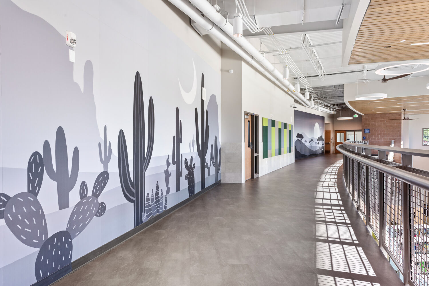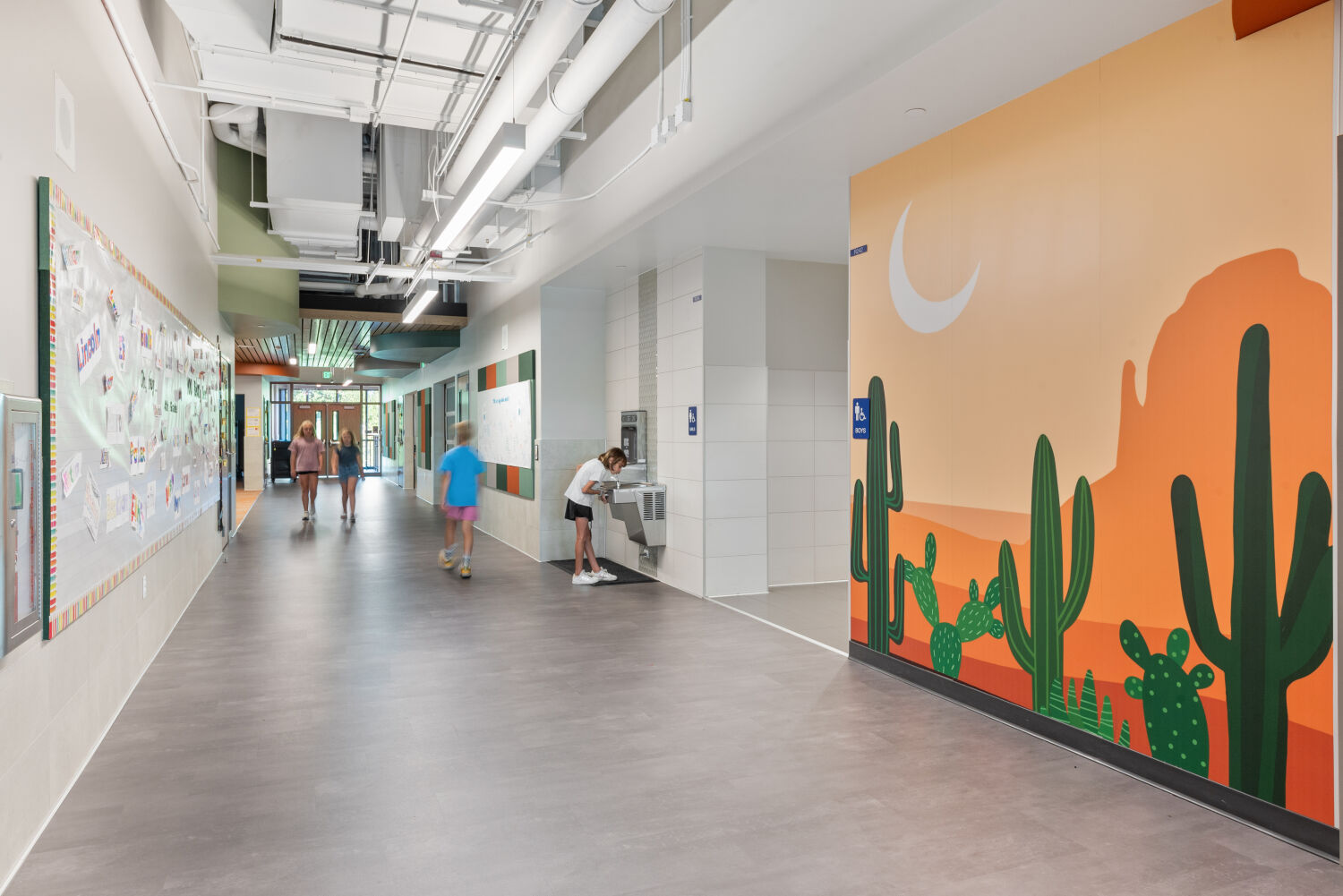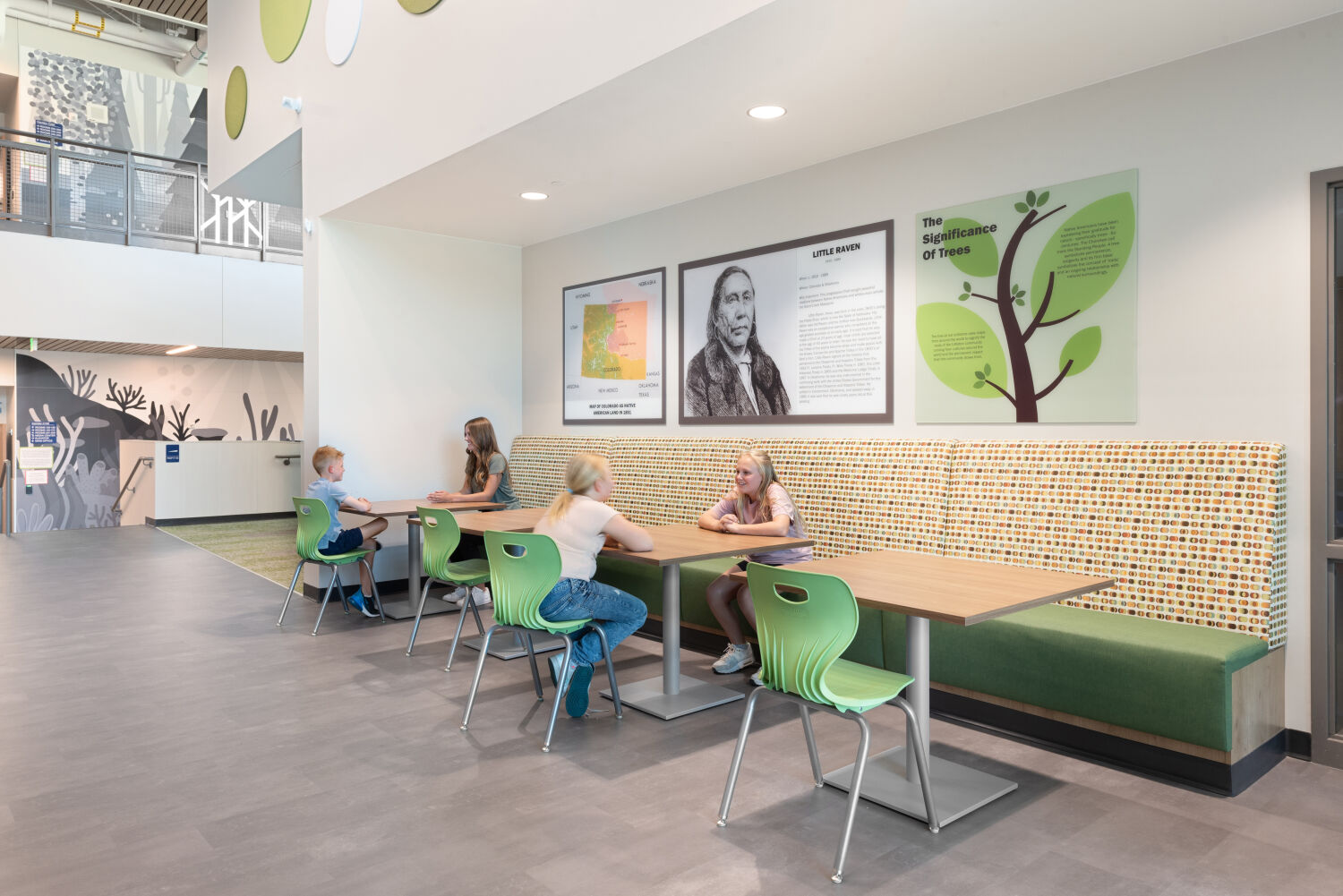 The design of Little Raven Elementary is rooted in the idea that learning flourishes when students feel connected to each other, their environment, and the broader world. Classroom pods are themed around Earth’s ecosystems, from rainforest to desert to ocean, creating immersive spaces that inspire curiosity and wonder. Input from families, educators, and community leaders shaped every decision, ensuring the school reflects the values and needs of its users. At the entry, a tree grows from the wall, its roots illustrated with imagery from cities worldwide, symbolizing unity, growth, and global connection. Throughout the design, indoor and outdoor spaces are woven together to create a seamless environment for exploration, collaboration, and play.