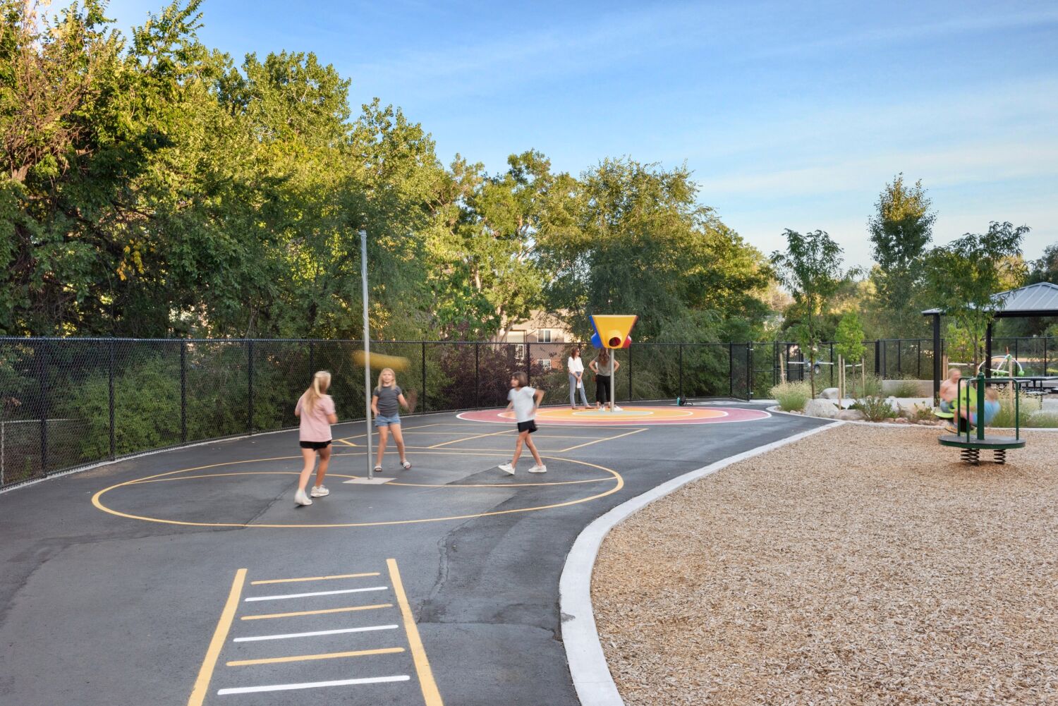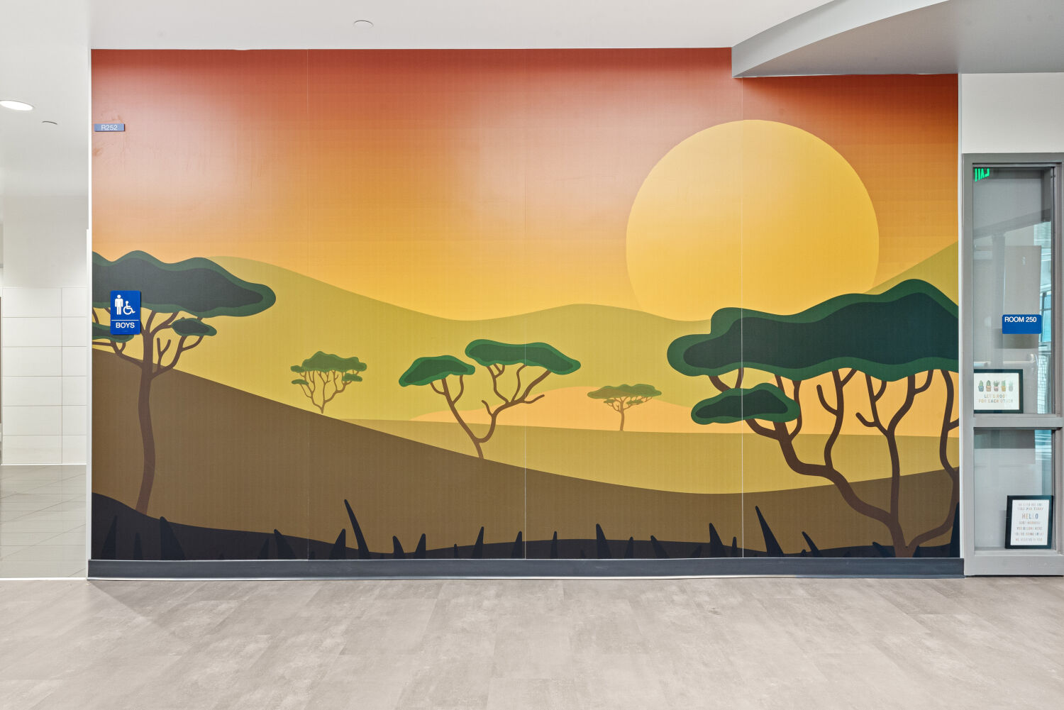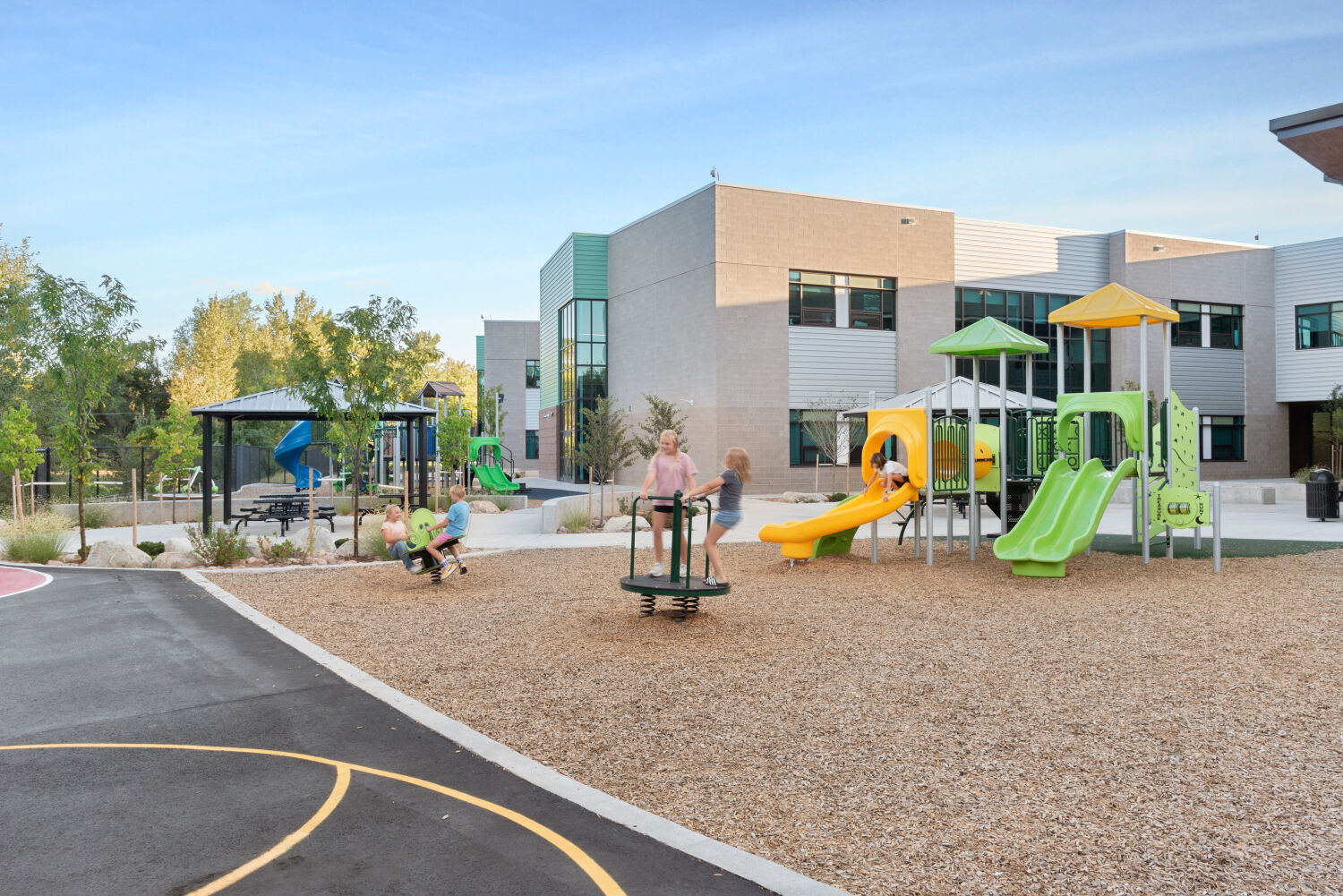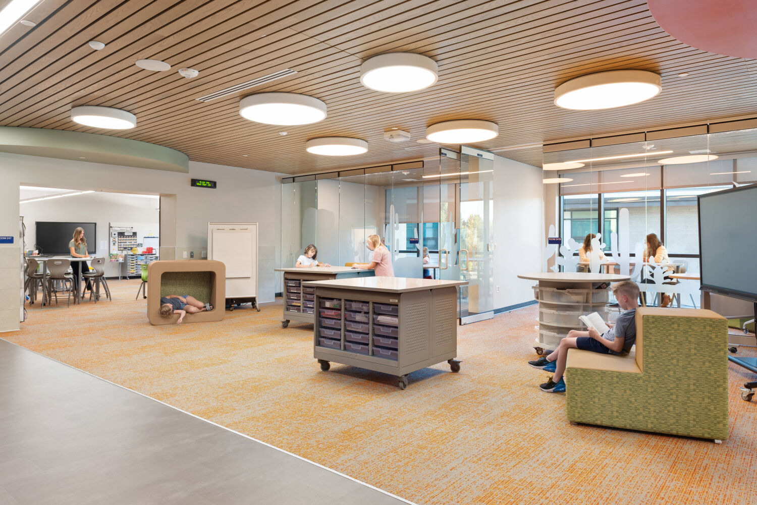 The design of Little Raven Elementary is rooted in the idea that learning flourishes when students feel connected to each other, their environment, and the broader world. Classroom pods are themed around Earth’s ecosystems, from rainforest to desert to ocean, creating immersive spaces that inspire curiosity and wonder. Input from families, educators, and community leaders shaped every decision, ensuring the school reflects the values and needs of its users. At the entry, a tree grows from the wall, its roots illustrated with imagery from cities worldwide, symbolizing unity, growth, and global connection. Throughout the design, indoor and outdoor spaces are woven together to create a seamless environment for exploration, collaboration, and play.