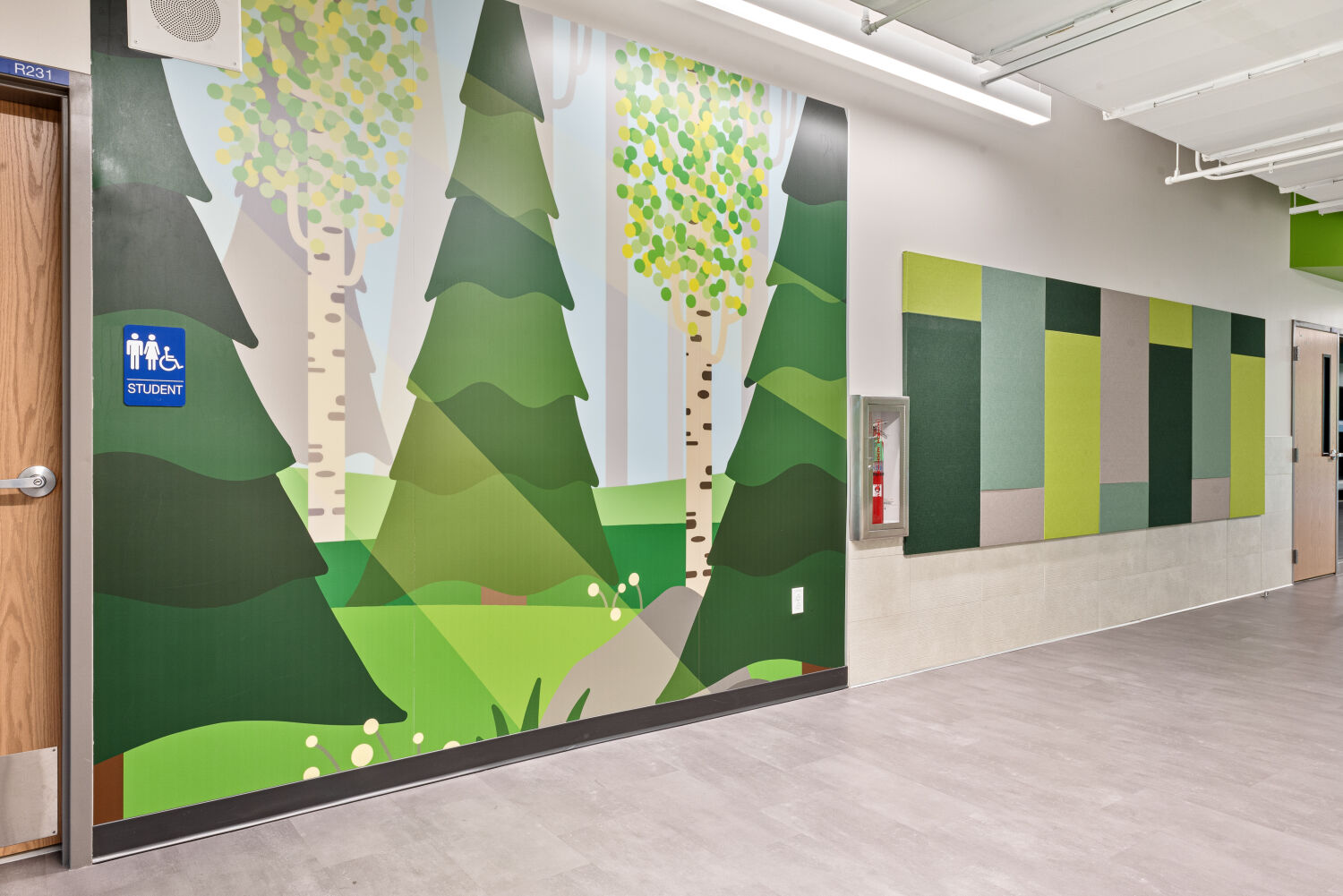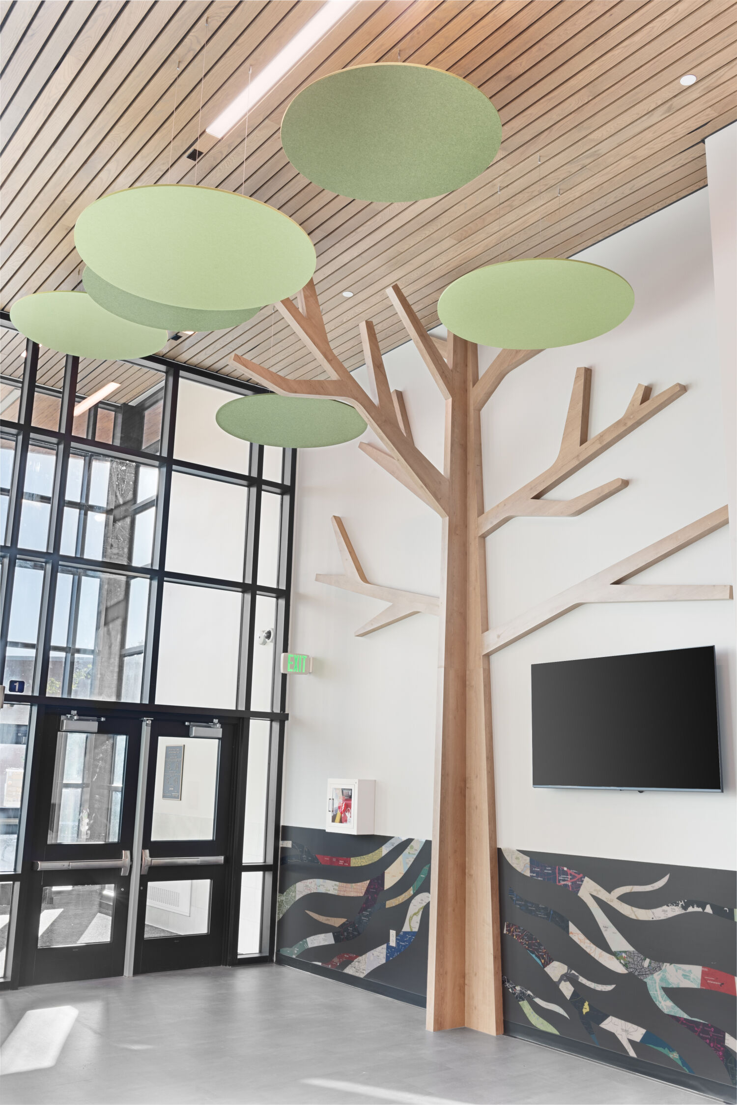Entry corridor with floor‑to‑ceiling windows at the main doors, large tree‑themed wall installation with circular green canopy panels, leaf‑shaped acoustic wall elements, patterned wall graphics, and adjacent seating alcove with tables and green chairs.