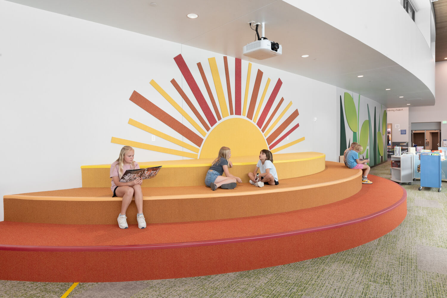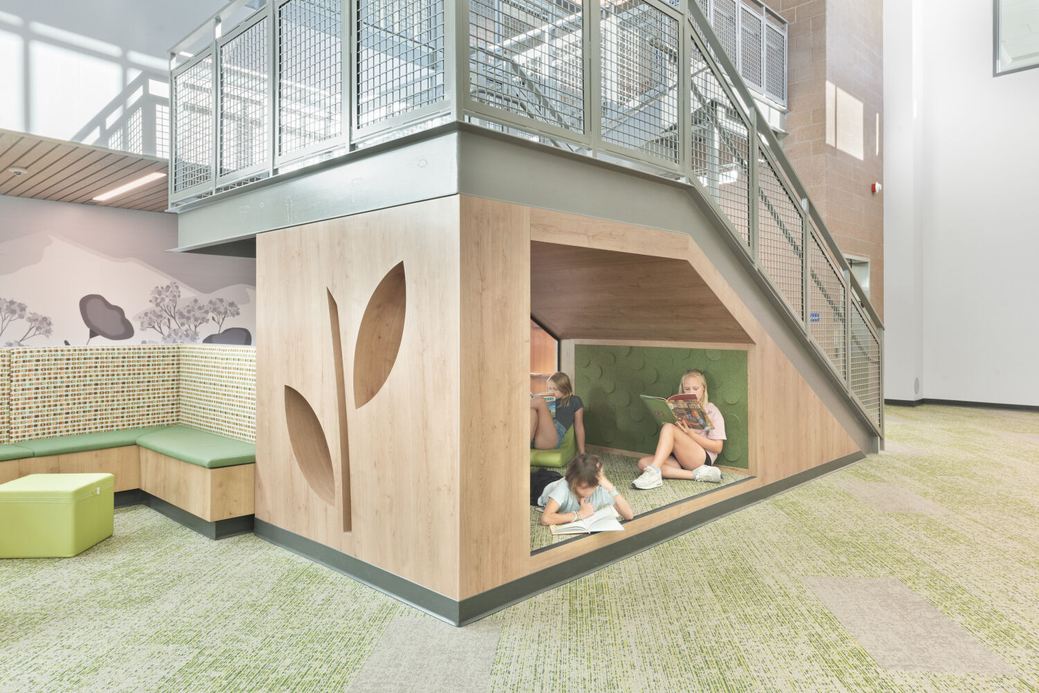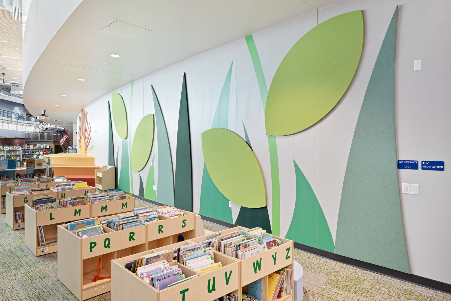 Media center reading area with low book bins organized by alphabet labels, patterned carpet flooring, and a large nature‑themed wall mural featuring oversized green leaf shapes.