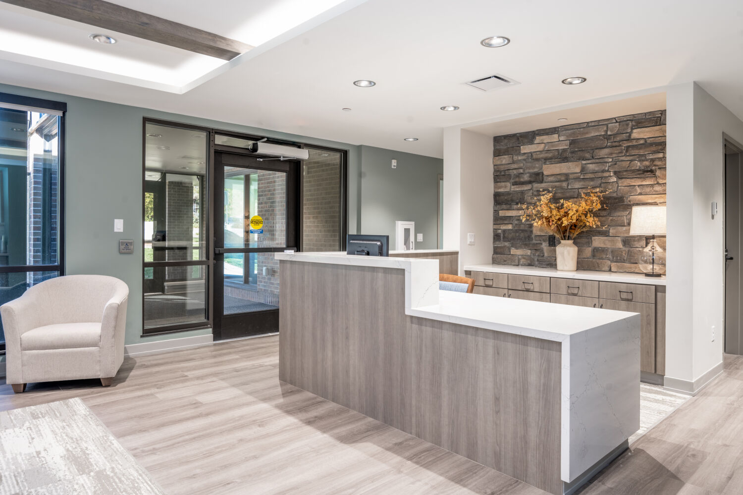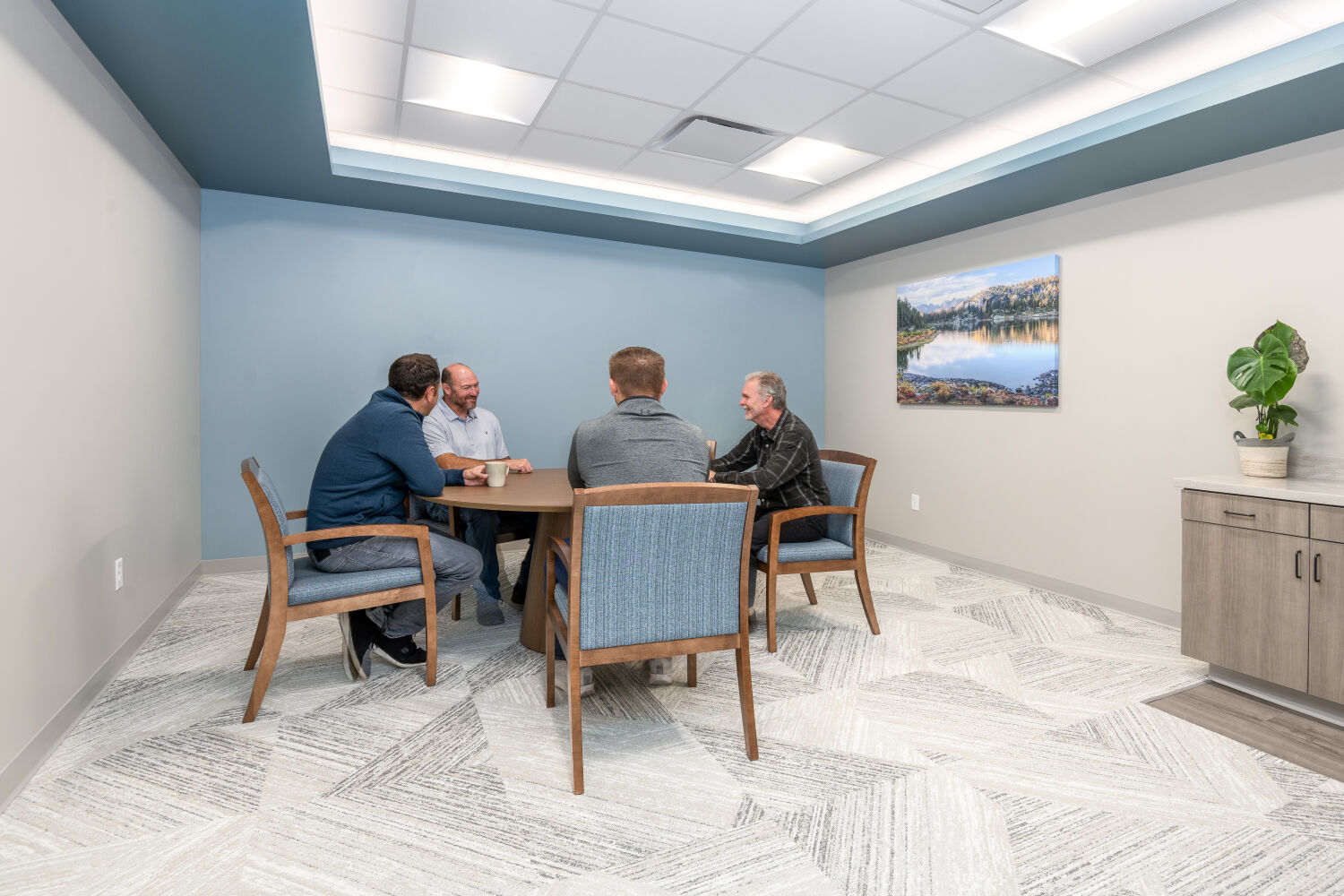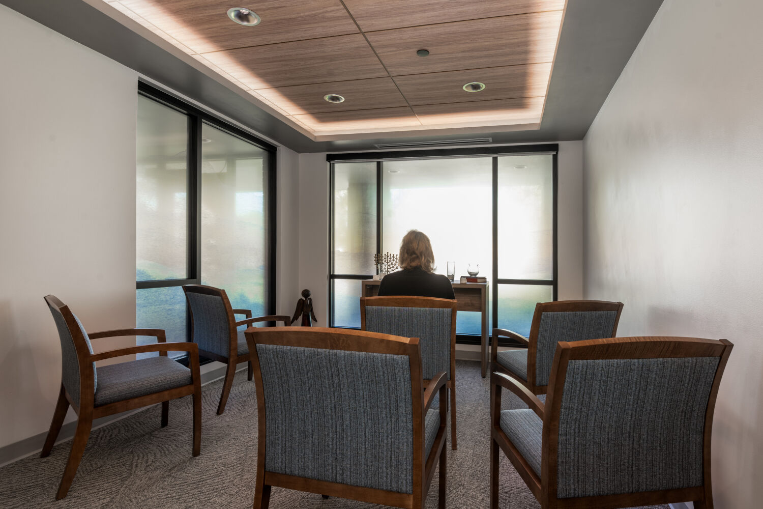 Design decisions—from the warm, home-like finishes to the soft, uplifting color palette of Refuge, Meditative, and Acacia Haze—reflect the center’s mission: to provide a place of refuge, contemplation, and resilience. Large windows bring natural light into every corner, supporting wellness and reducing reliance on artificial lighting. Thoughtful circulation and semi-private seating areas allow both staff and clients to pause, reflect, and recharge in comfort.