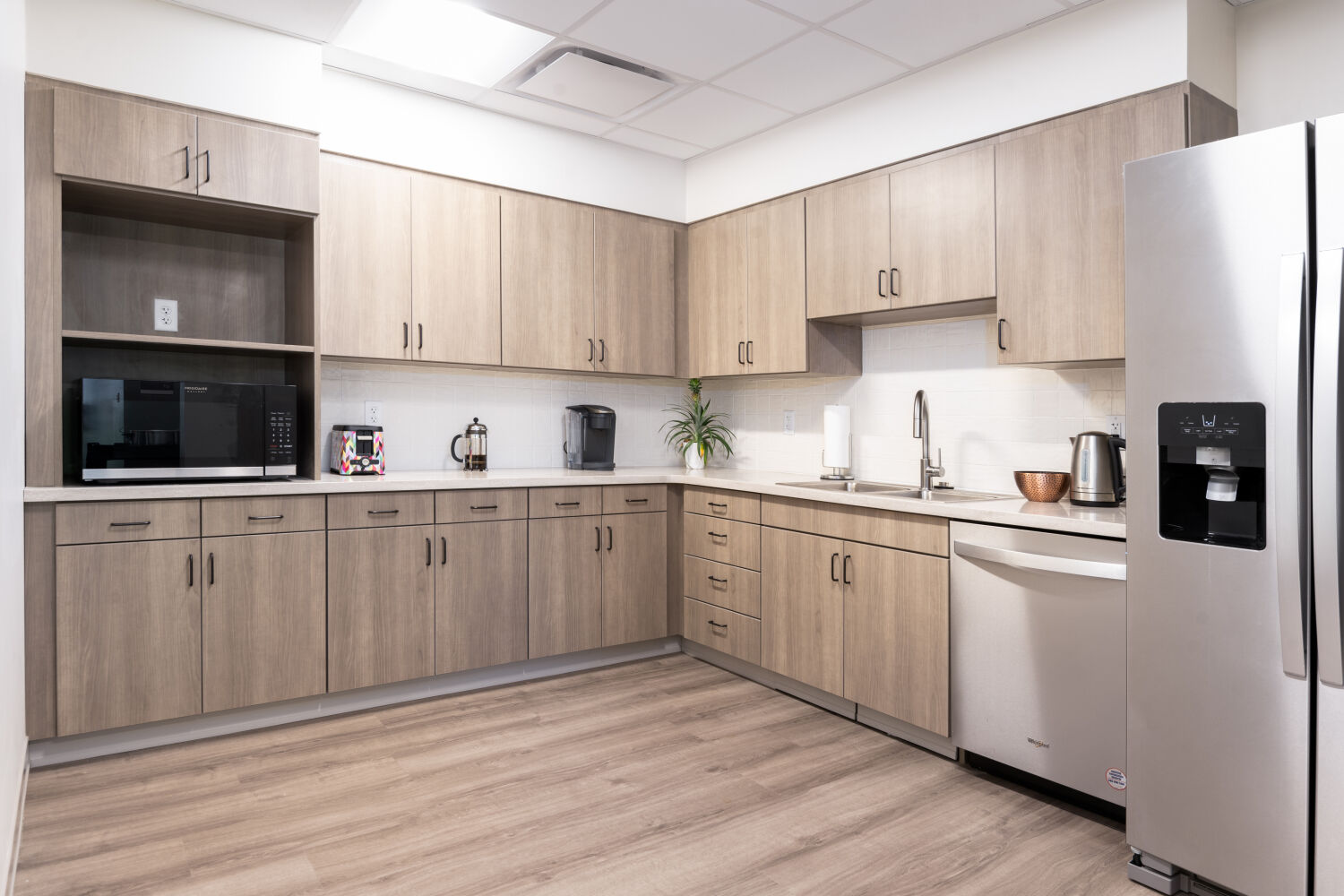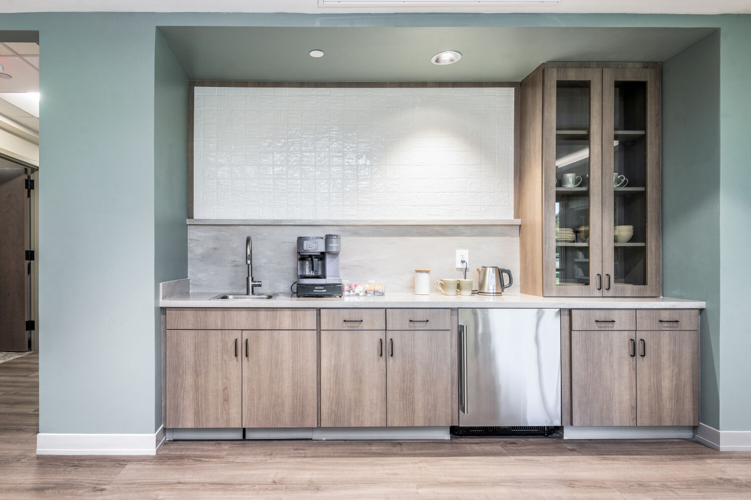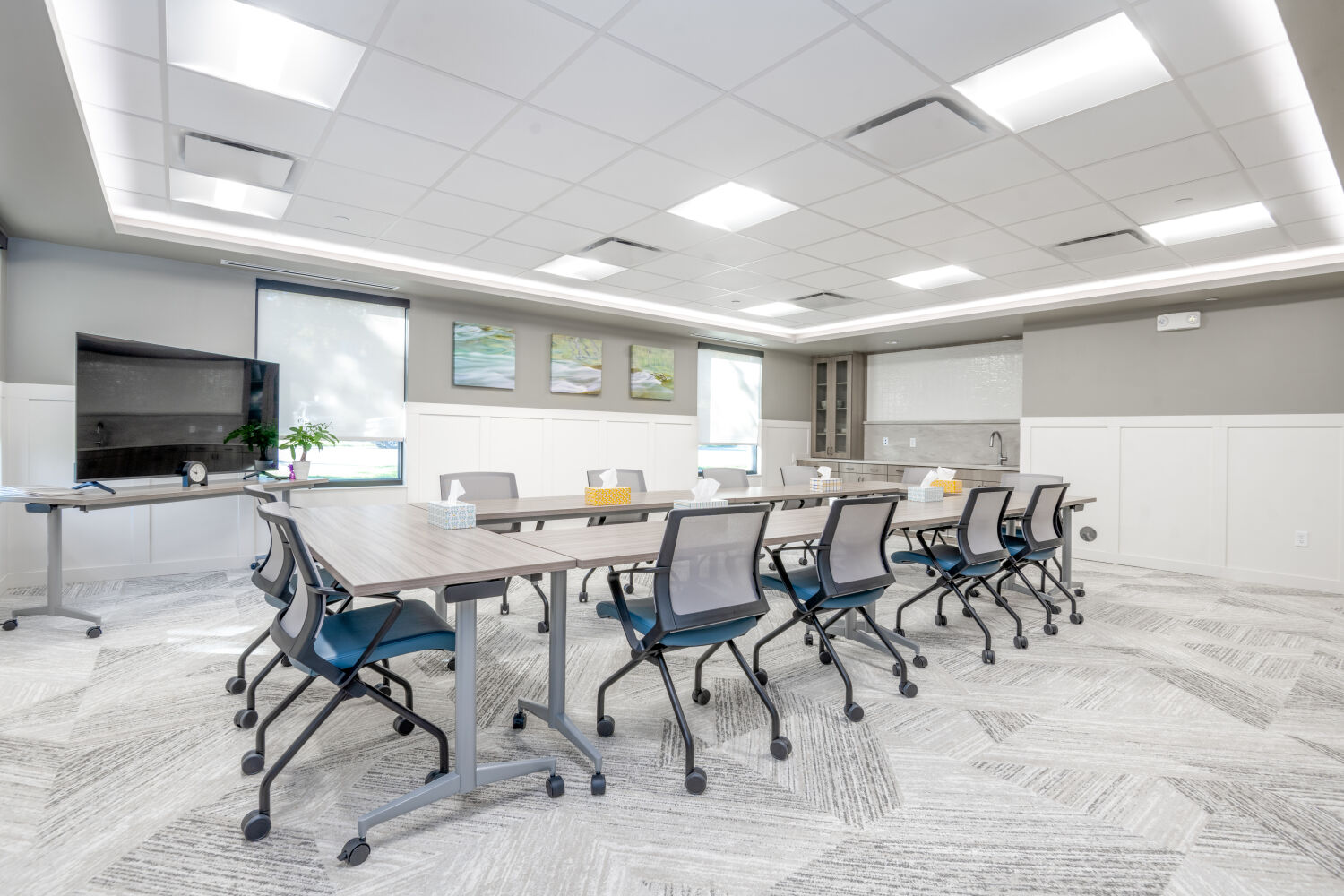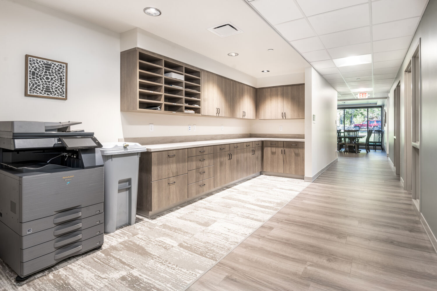 Design decisions—from the warm, home-like finishes to the soft, uplifting color palette of Refuge, Meditative, and Acacia Haze—reflect the center’s mission: to provide a place of refuge, contemplation, and resilience. Large windows bring natural light into every corner, supporting wellness and reducing reliance on artificial lighting. Thoughtful circulation and semi-private seating areas allow both staff and clients to pause, reflect, and recharge in comfort.