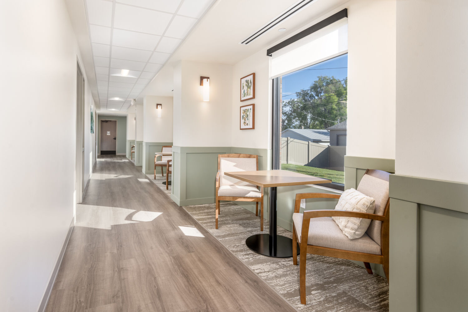 Respite area along a corridor with upholstered armchairs, a small wood table, pale green wainscoting, framed artwork, and a large window bringing in natural light.