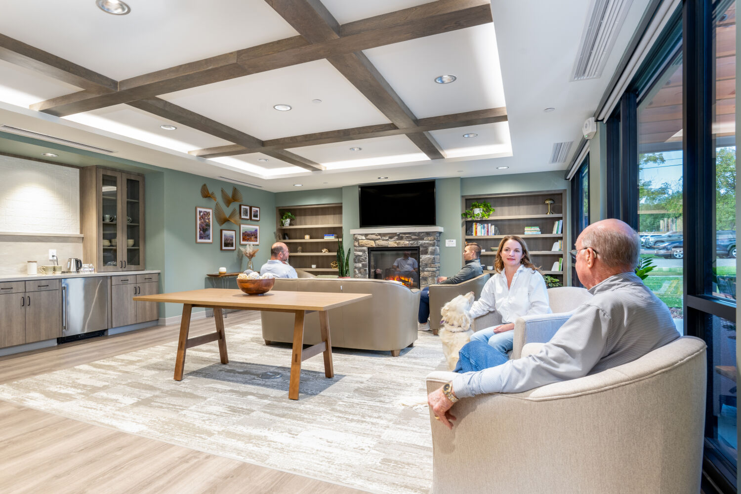 Warm living room lobby with a stone fireplace, built‑in shelving, gray lounge seating, wood ceiling beams, large windows, and a kitchenette with light wood cabinetry.