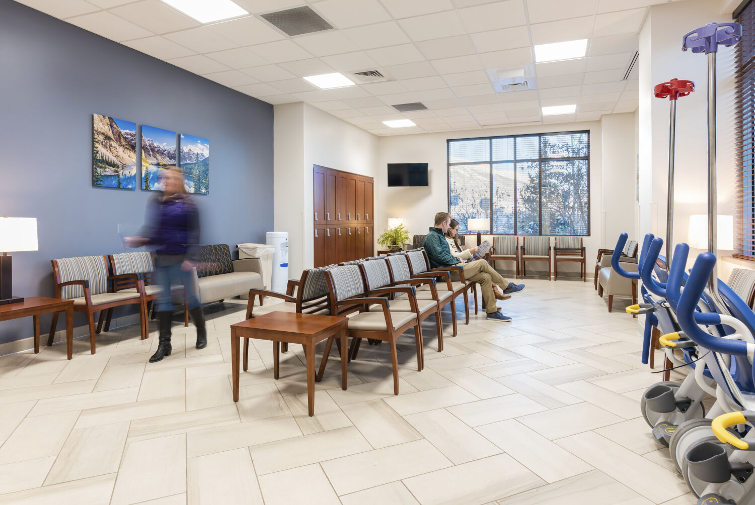 Emergency department waiting area with rows of upholstered chairs, wood side tables, wall-mounted landscape artwork, a water dispenser, large windows, tile flooring, and a view toward the reception desk and staff corridor.