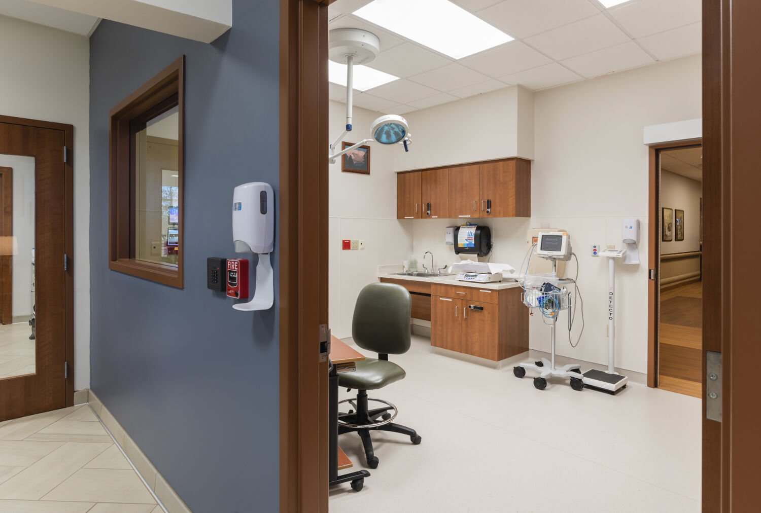 Exam room with a reclining exam chair covered in a white sheet, wall-mounted diagnostic equipment, wood cabinetry with a sink, ceiling-mounted procedure light, IV pole, and a computer workstation on an adjustable arm.