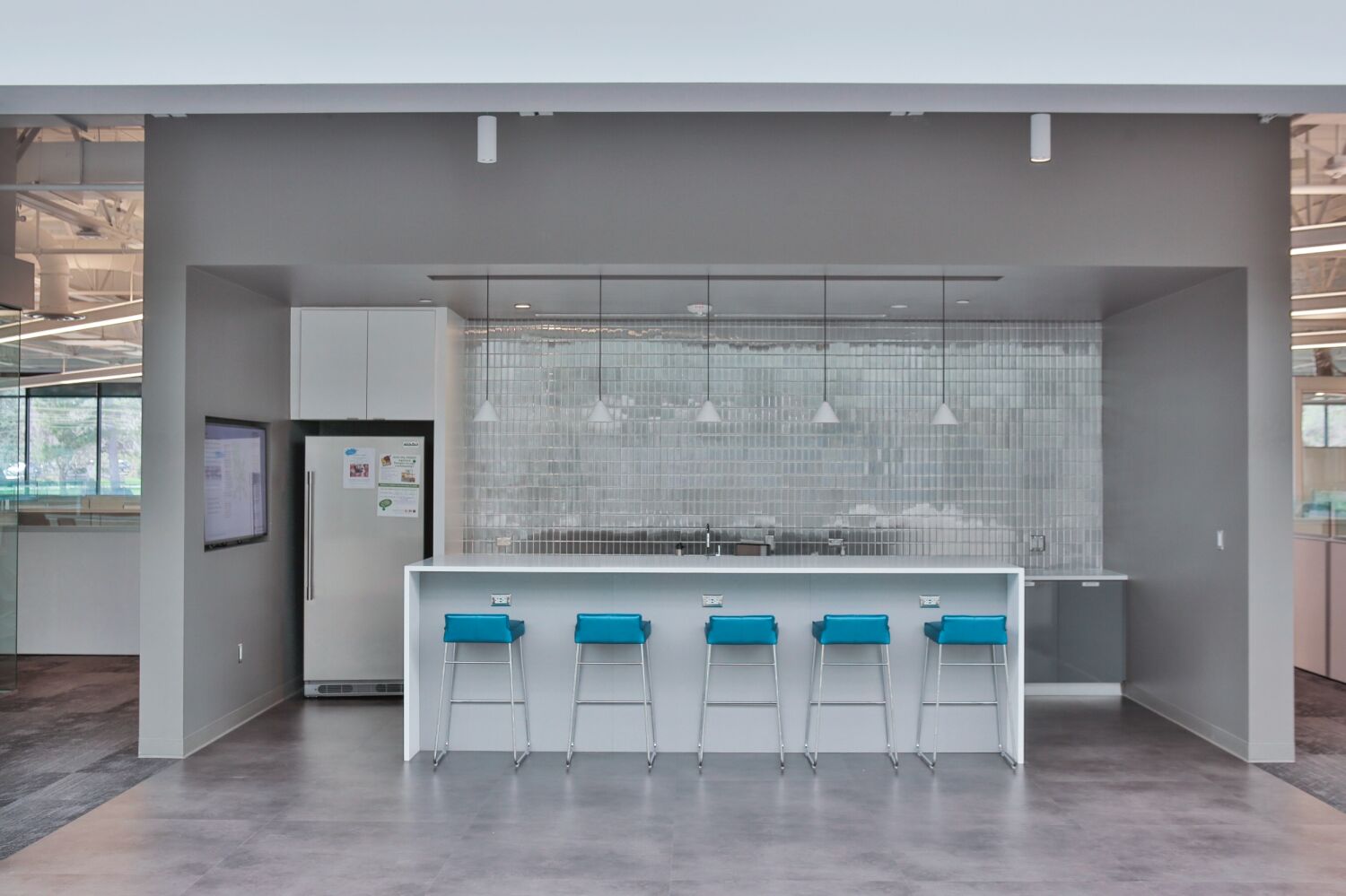 Woodward Drake corridor with a glass‑walled conference room, open collaboration area with high‑top seating, and linear ceiling lighting extending toward a skylit atrium.