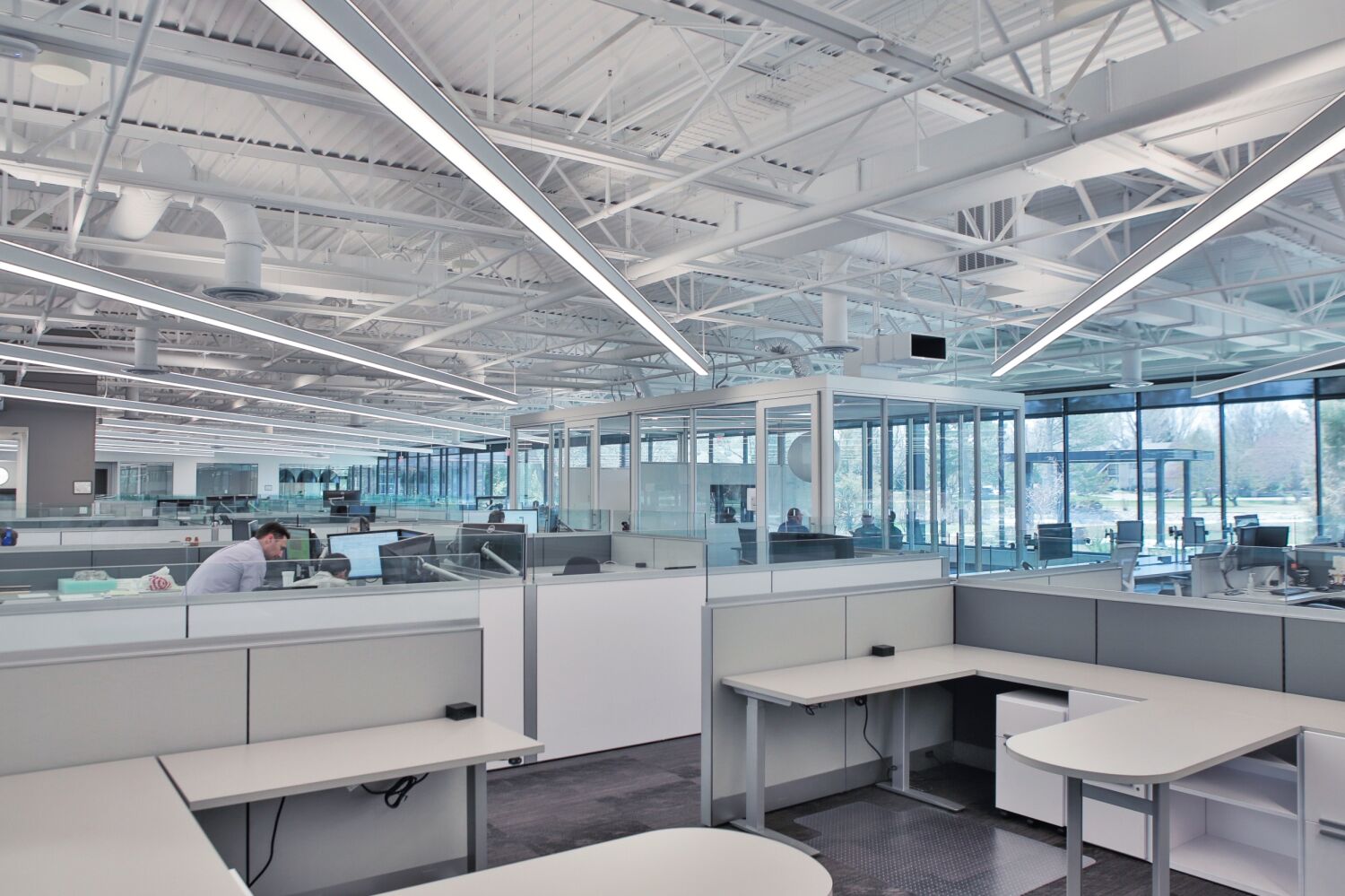 Woodward Drake bright open office area with glass‑walled meeting rooms, low workstations, and a large skylight ceiling that brings in natural light.